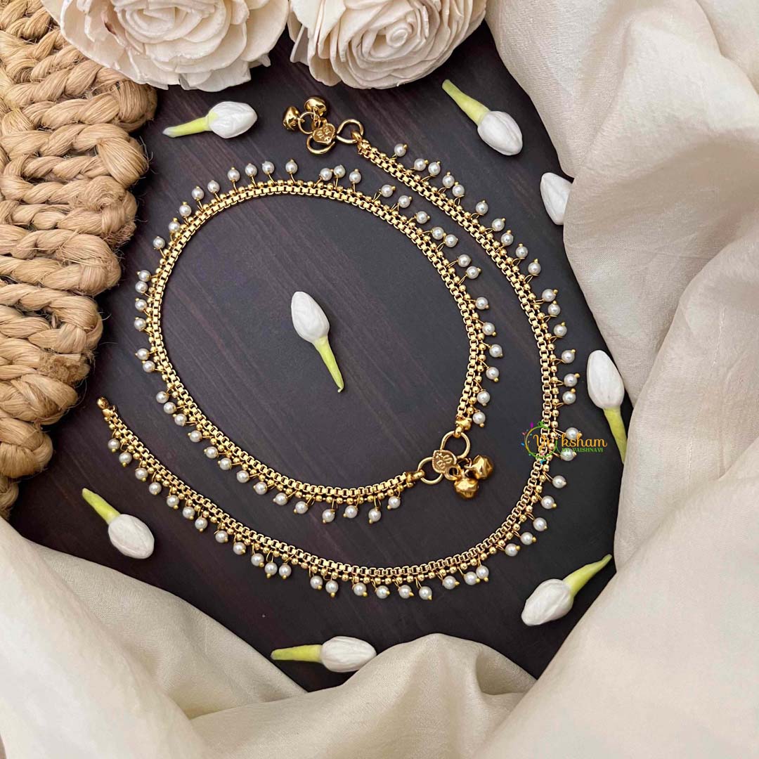 This classic golden chain anklet showcases an distinctive dock-inspired design, elegantly punctuated with pearl drops that add dimension and allure. The structured yet graceful silhouette merges traditional craftsmanship with contemporary aesthetics, creating a piece that commands attention without demanding it. Ideal for those who appreciate architectural detail in their jewelry, this anklet pairs beautifully with both casual and formal attire. A sophisticated accessory that celebrates refined taste and enduring style.