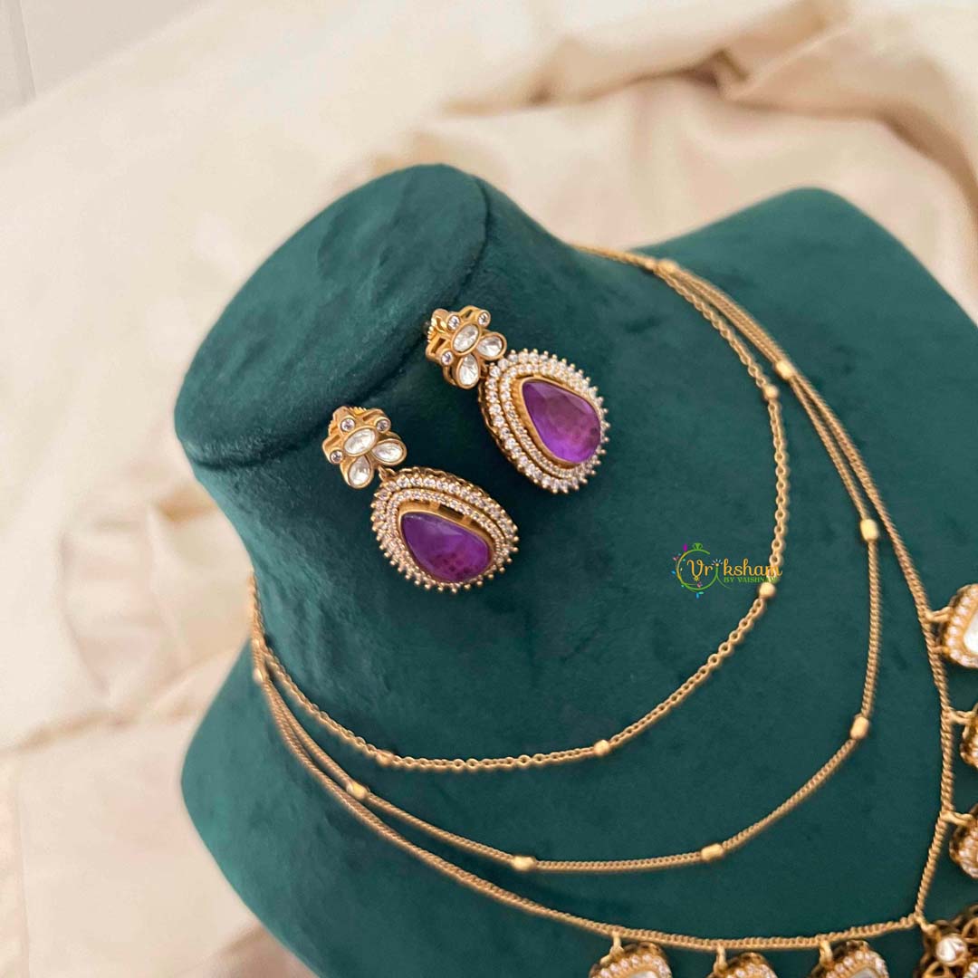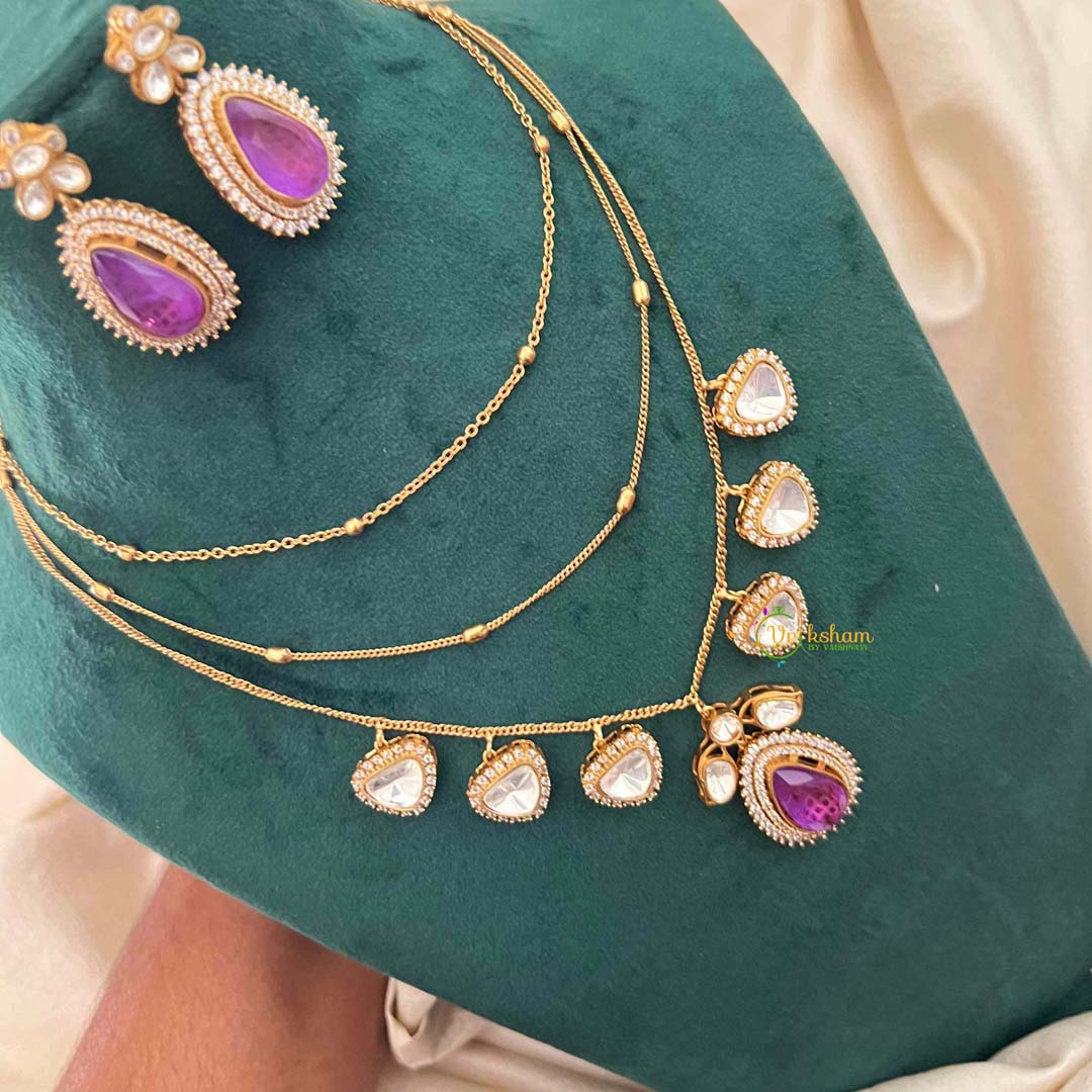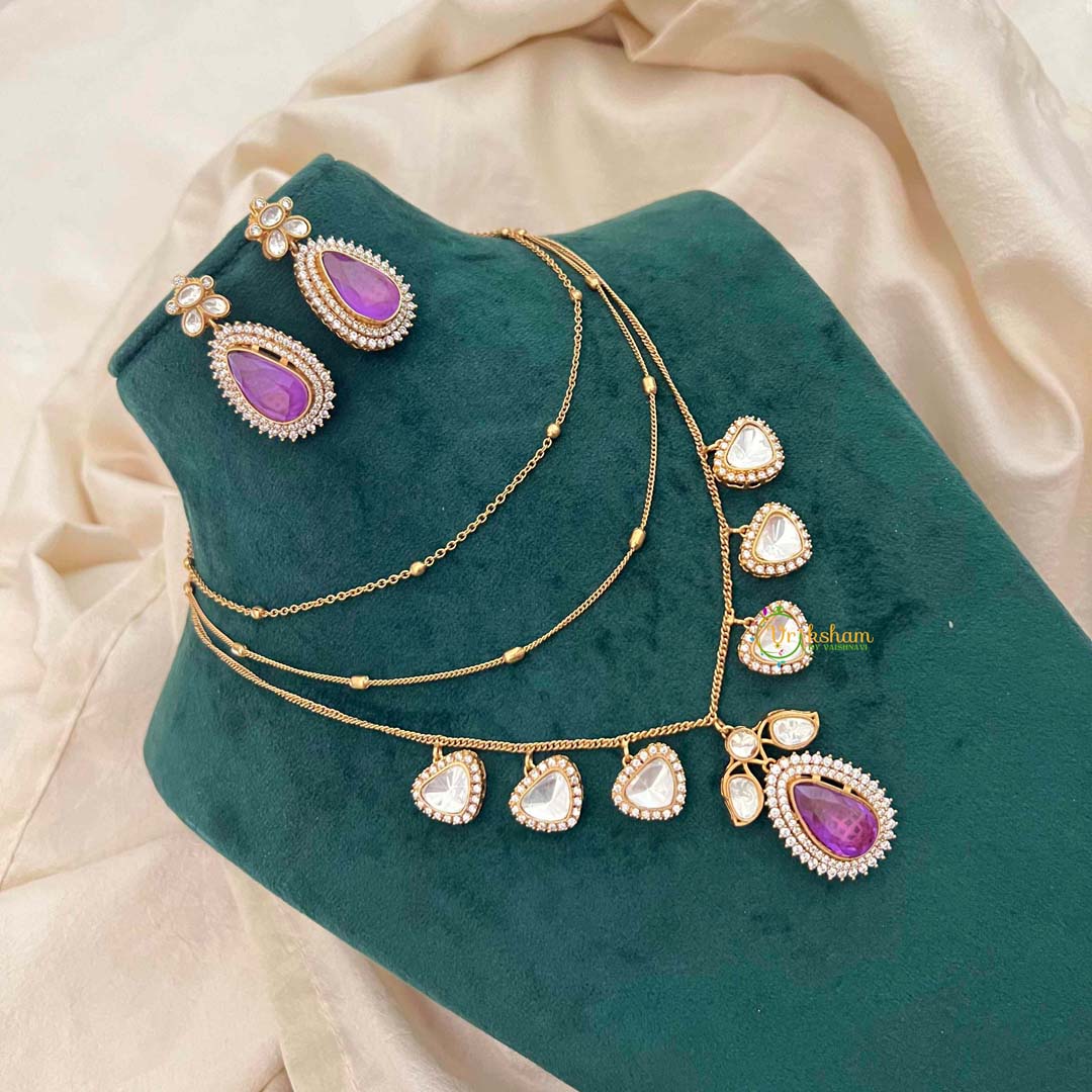 Elevate your neckline with this sophisticated pendant chain, featuring a striking pear-shaped centerpiece in rich purple tones. The classic golden chain construction showcases three gracefully layered strands that create dimensional depth and visual interest. This multi-layered design offers versatile styling options, allowing you to wear it as a unified statement or adjust the layers for personalized elegance. The lustrous golden finish complements the deep purple pendant beautifully, making it an ideal accessory for both festive occasions and refined everyday wear. A timeless piece that seamlessly transitions from traditional to contemporary settings with understated glamour.