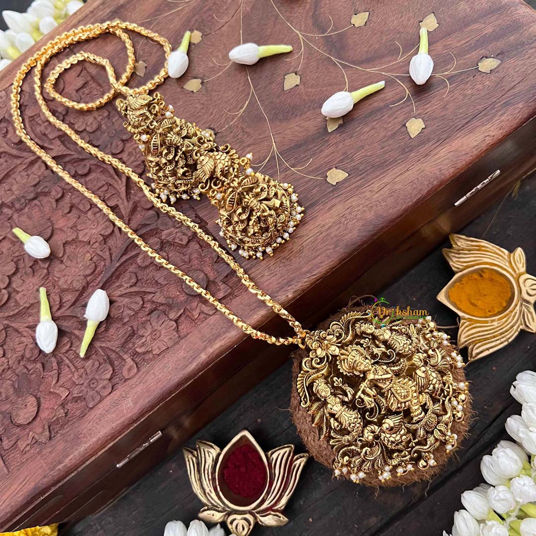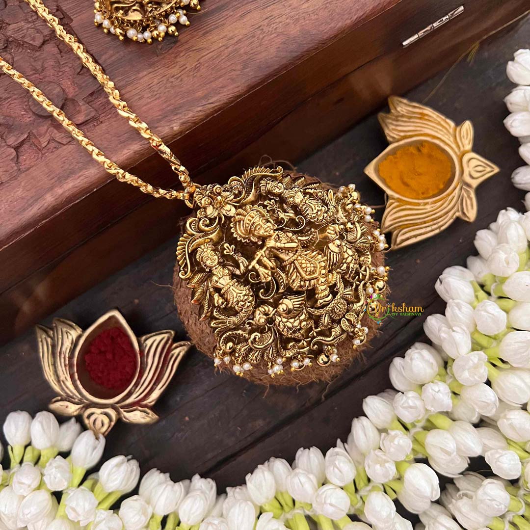 Radiate divine elegance with this Classic Golden Look Krishna Idol neckpiece, a timeless expression of devotion rendered in warm, lustrous tones. The pendant features Lord Krishna captured in exquisite detail, suspended from a delicate chain adorned with gleaming gold beads that add texture and visual interest. The extended length allows for graceful draping, making it versatile for weddings, spiritual occasions, and everyday wear. Each gold bead has been carefully selected to complement the pendant's radiance, creating a harmonious composition that honors traditional aesthetics. A sophisticated accessory that connects you to Krishna's divine presence while elevating any ensemble with understated luxury and cultural significance.