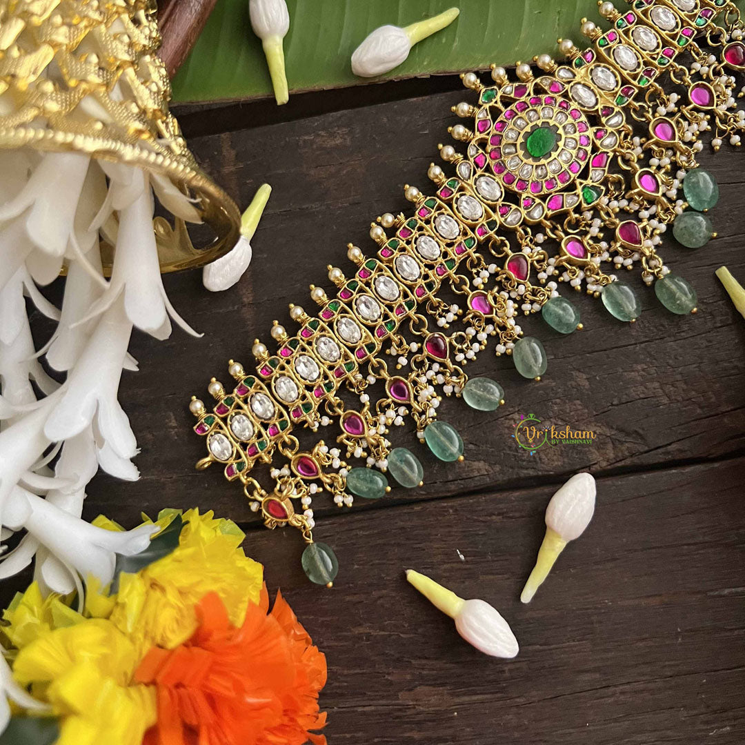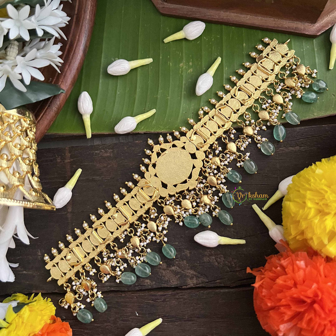 Embrace timeless elegance with this exquisite traditional neckpiece, featuring a striking golden square pendant adorned with delicate pink floral detailing. The sophisticated design is complemented by vibrant green beads that add a pop of color and cultural richness. Perfect for festive occasions, weddings, or everyday wear, this short neckpiece seamlessly blends heritage craftsmanship with contemporary style. The harmonious combination of warm gold tones, soft pink accents, and refreshing green creates a versatile piece that elevates any ensemble with grace and authenticity.