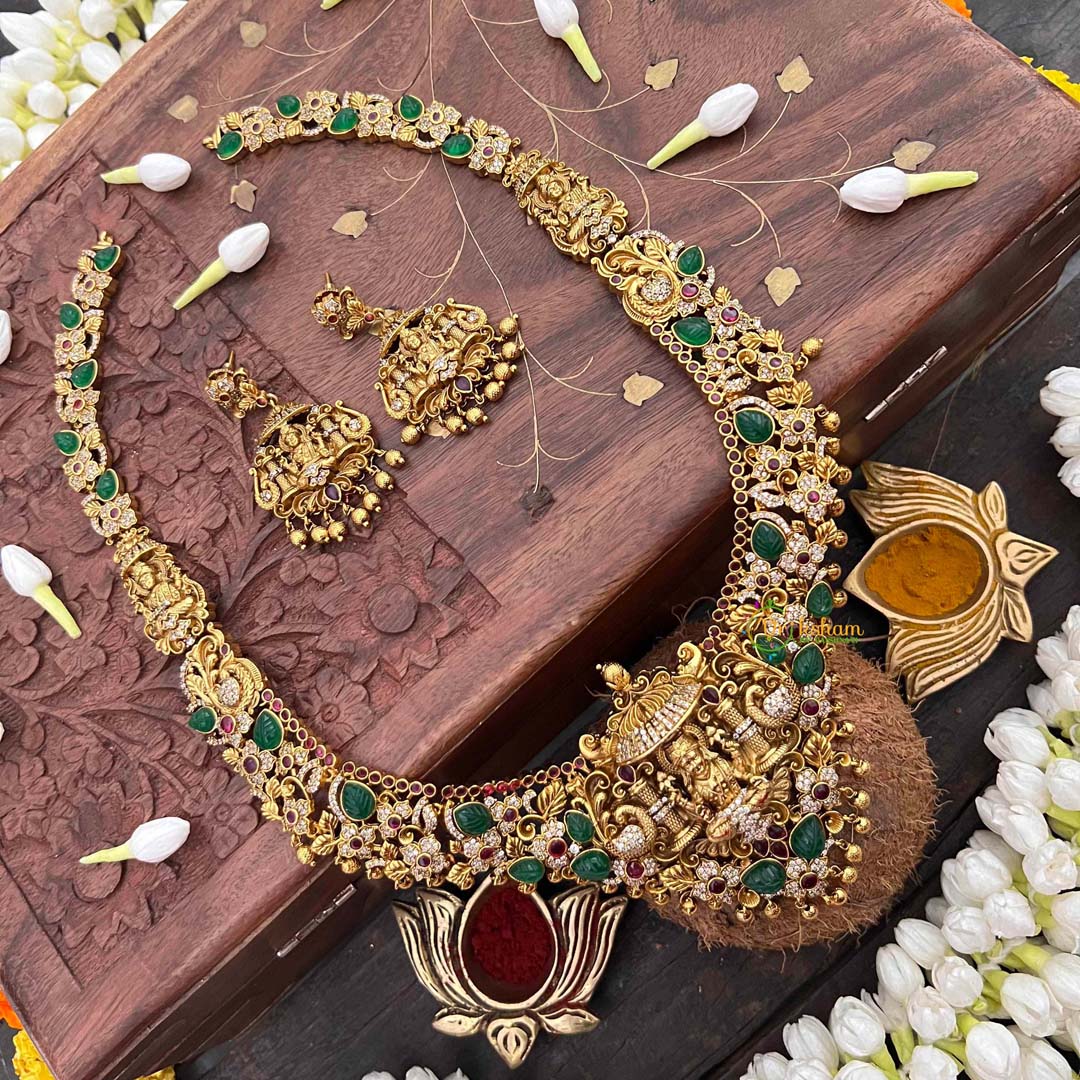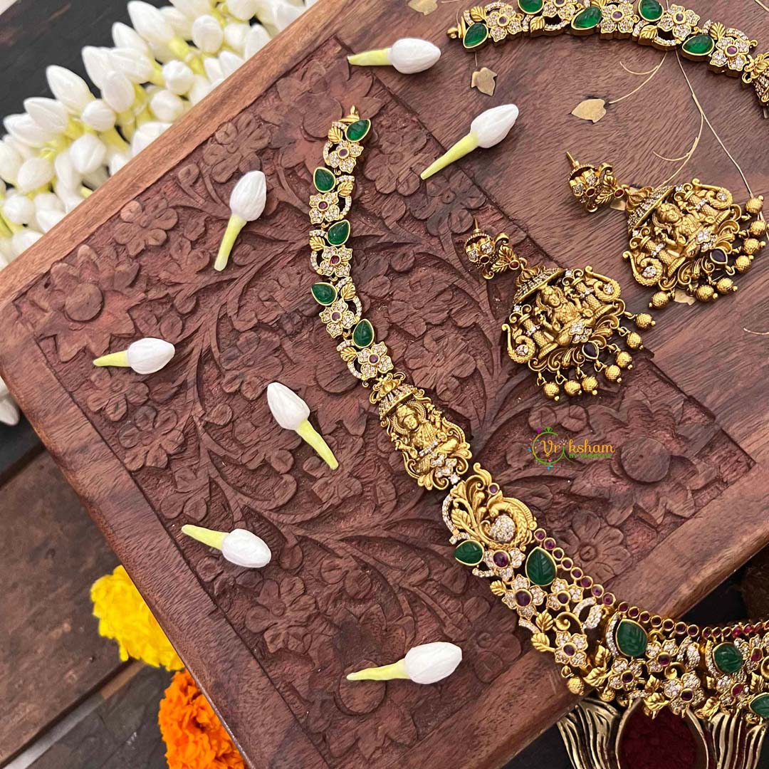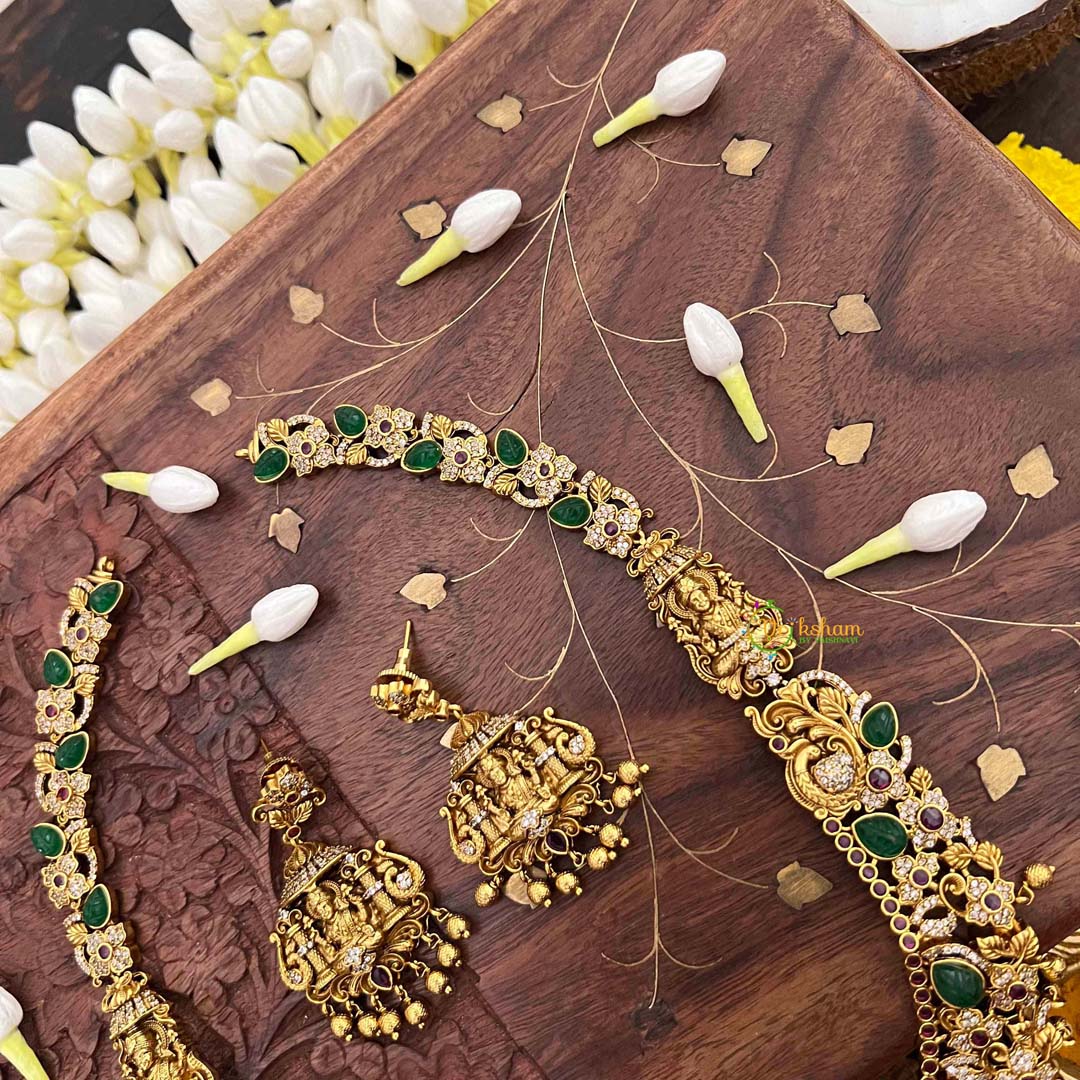 Radiate divine abundance with this Classic Lakshmi neckpiece, an elegant homage to timeless prosperity and grace. Sparkling AD stones create a luminous focal point, artfully paired with lustrous gold beads and vibrant green and red embellishments that celebrate auspicious heritage. The extended silhouette drapes with refined poise, offering versatility for weddings, temple visits, and cherished celebrations. This piece seamlessly merges spiritual symbolism with contemporary design sensibilities, making it an indispensable addition to any discerning collection. Wear it as a personal talisman of wealth and well-being, or gift it as a blessing to those you hold dear.