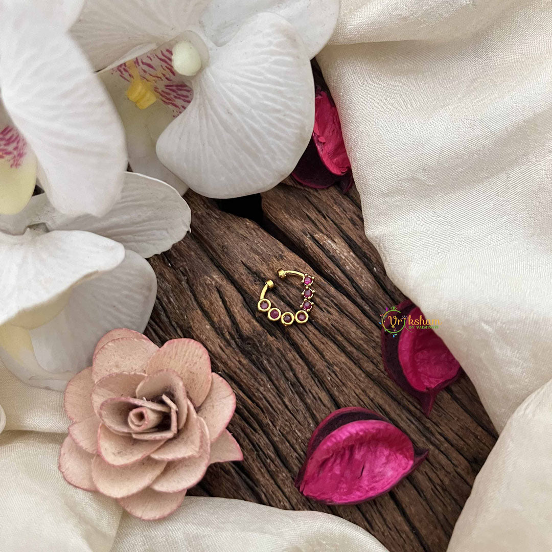 The Vriksham Classic Leaf Shape Septum Ring in a gold-toned finish is exquisitely accented with striking red Kundan stones. Its elegant leaf motif combines timeless design with refined sophistication, making it a standout accessory that adds a touch of vibrant charm to any ensemble.