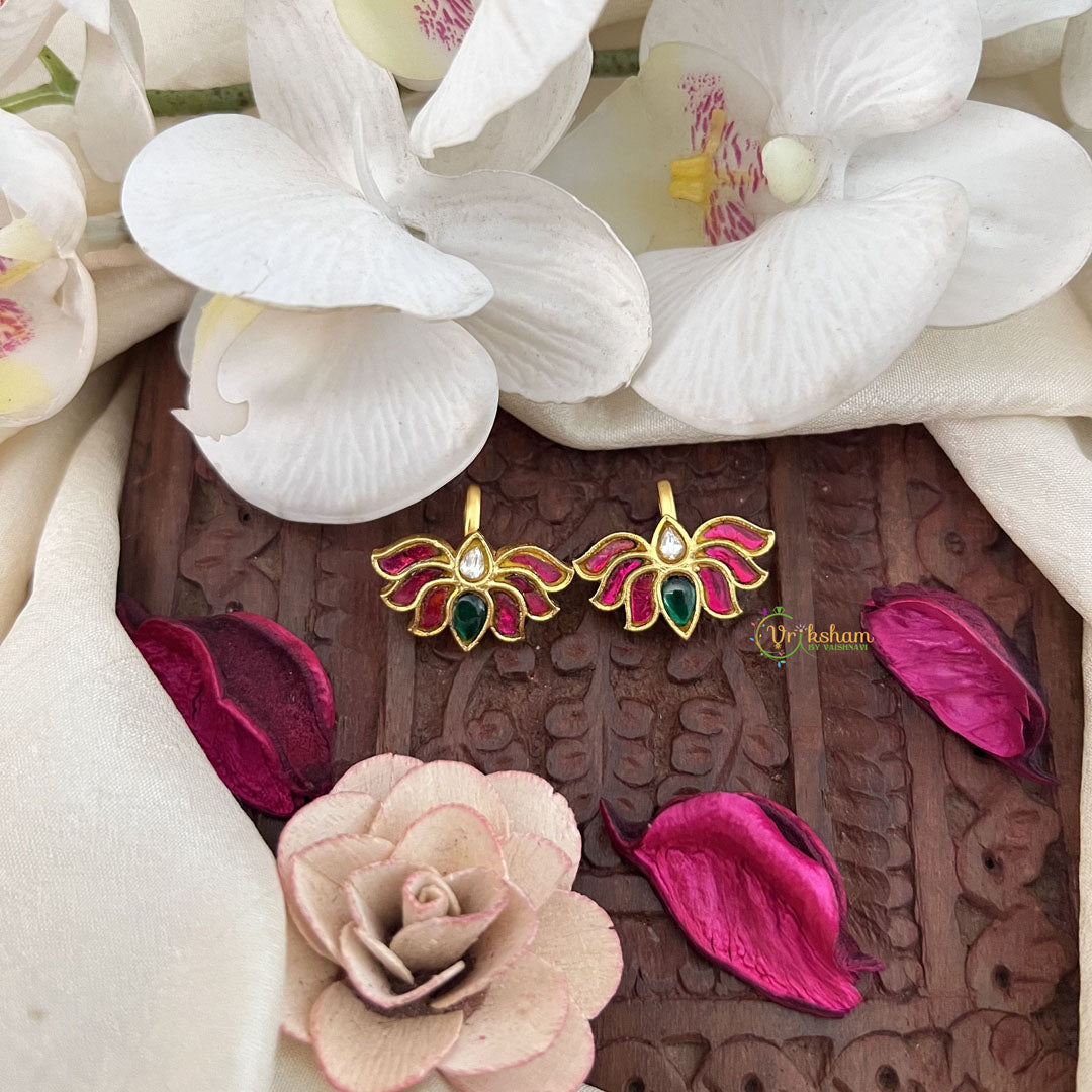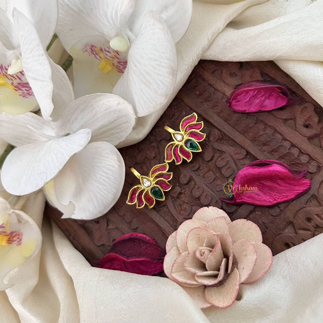 The Vriksham Classic Lotus Style Kundan Jadau Press Bugadi in green, red, and white features a timeless lotus design crafted with exquisite kundan and jadau detailing. This sophisticated accessory enhances traditional attire with its vibrant colors and elegant craftsmanship, making it an ideal choice for special occasions and celebrations.