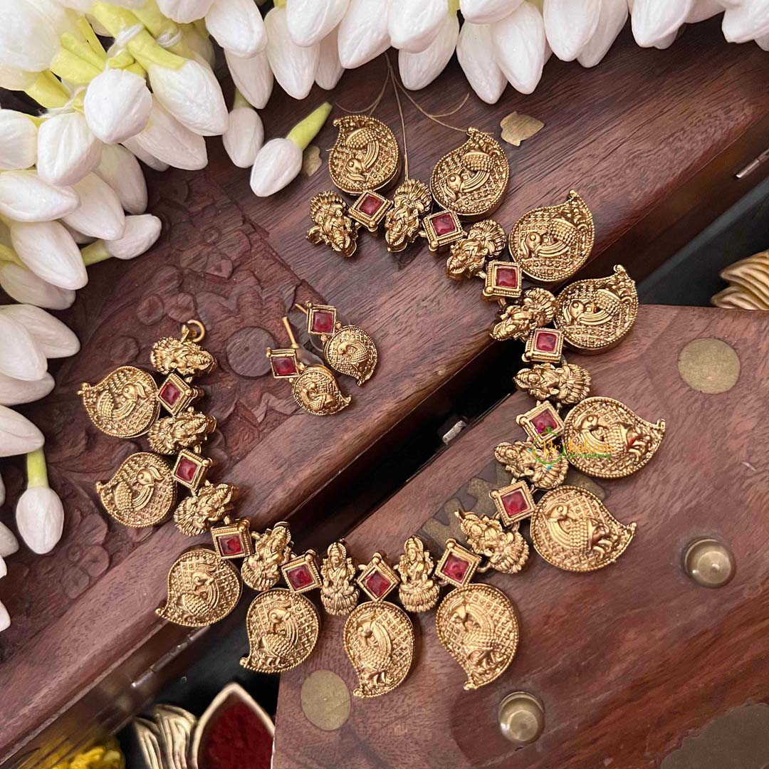 Discover the divine elegance of this Classic Manga & Lakshmi Style Short Neckpiece, a harmonious blend of traditional craftsmanship and spiritual symbolism. Featuring the auspicious Lakshmi motif intricately paired with traditional manga design elements, this piece celebrates prosperity and grace. The verdant green thread weaving throughout adds a natural, earthy dimension while maintaining an air of refined sophistication. Designed to sit gracefully at the collarbone, this short neckpiece is an ideal companion for festive celebrations, religious occasions, or anyone seeking to honor cultural heritage with understated elegance. A timeless treasure for those who appreciate jewelry that carries both aesthetic beauty and meaningful significance.