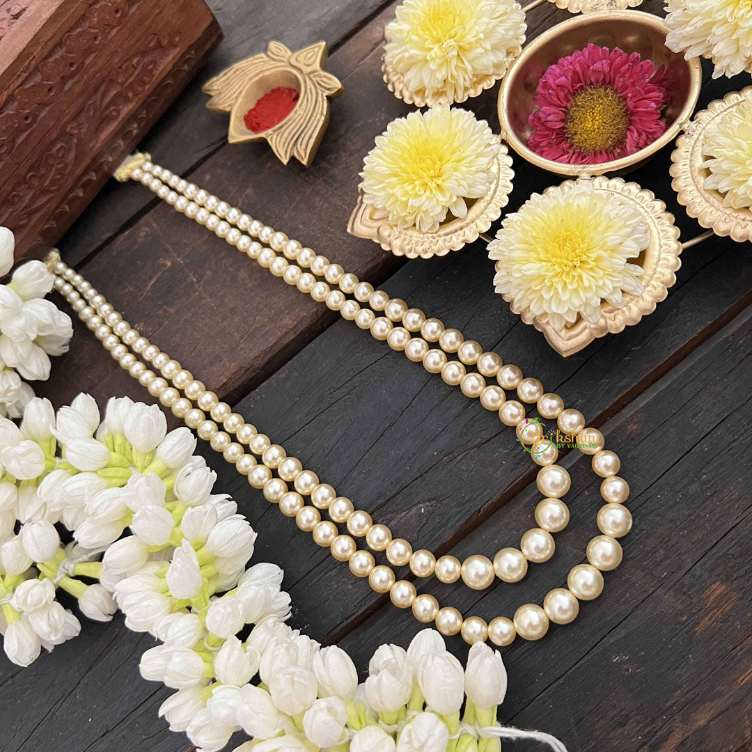 Experience understated luxury with this elegant two-layered pearl neckpiece, inspired by timeless Indian jewelry heritage. The dual strands of radiant pearls create a balanced, refined silhouette that enhances any occasion with subtle sophistication. Whether adorning traditional attire or contemporary ensembles, this versatile piece brings an air of graceful elegance to your personal style. Perfect for weddings, festivals, and milestone celebrations, the minimalist multi-strand design offers effortless beauty while maintaining the classic allure that defines enduring jewelry craftsmanship.