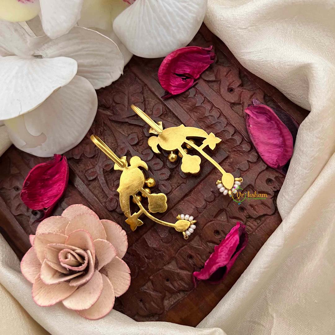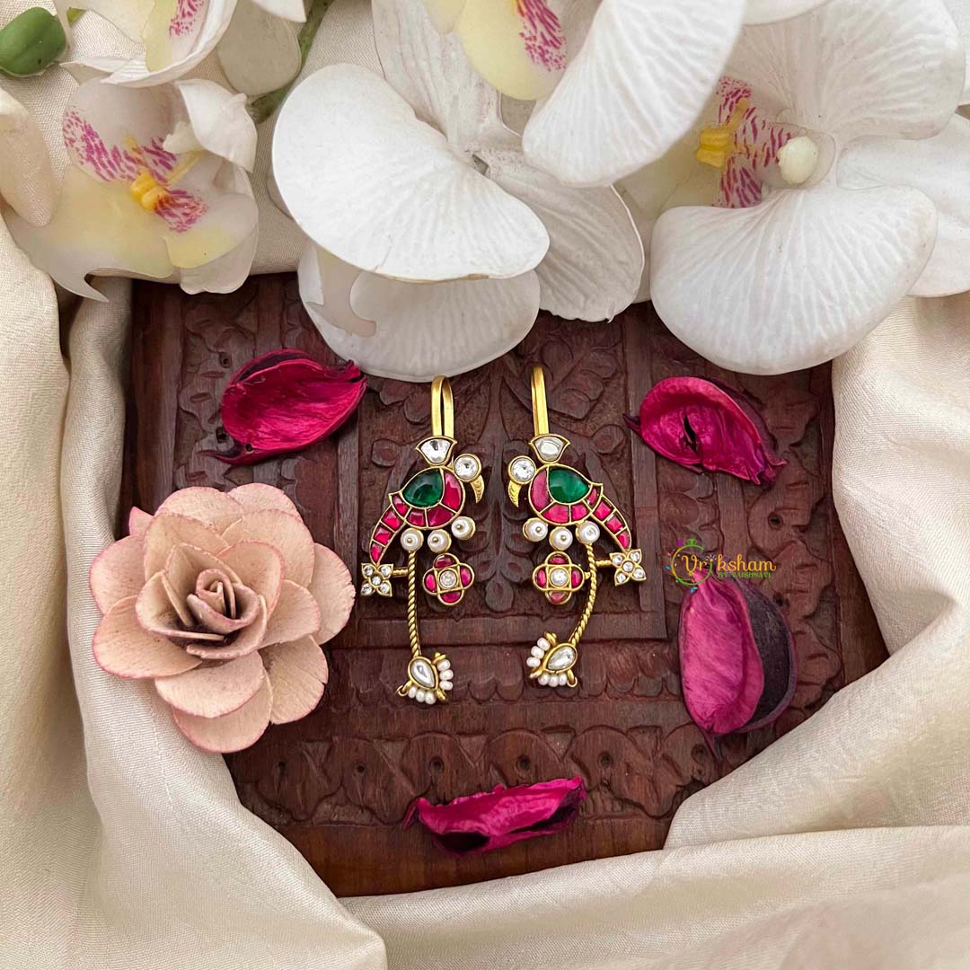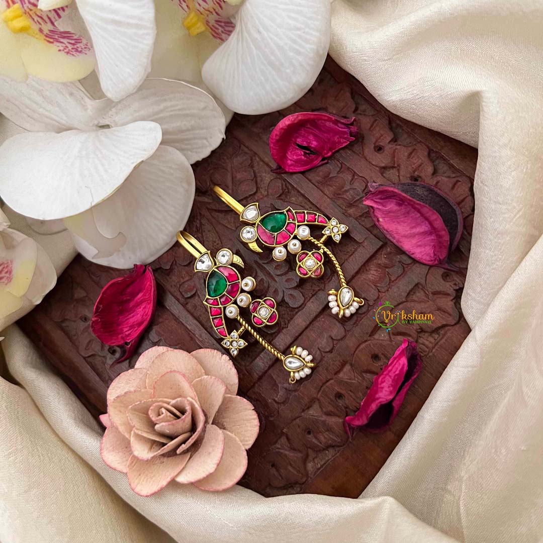 Celebrate vibrant artistry with this Classic Parrot Style Pearl Detailing Kundan Jadau Bugadi in rich red, white, and green hues. This stunning creation showcases intricately carved parrot designs rendered through time-honored kundan and jadau techniques, complemented by delicate pearl accents that enhance its luminous appeal. The harmonious blend of jewel tones—deep red, pristine white, and verdant green—creates a captivating visual narrative inspired by nature's most elegant bird. Perfect for weddings, festive celebrations, and special occasions, this piece exemplifies the pinnacle of traditional Indian jewelry craftsmanship. Each meticulously set gemstone reflects the dedication of skilled artisans, resulting in a heirloom-quality accessory that brings together cultural heritage and sophisticated elegance.