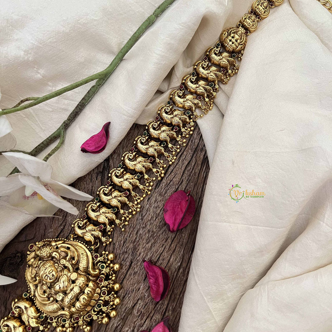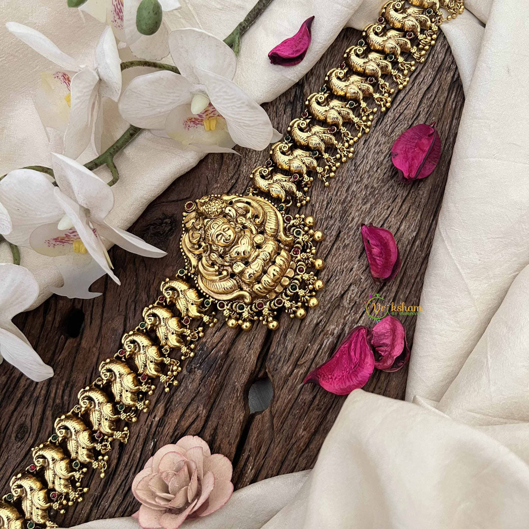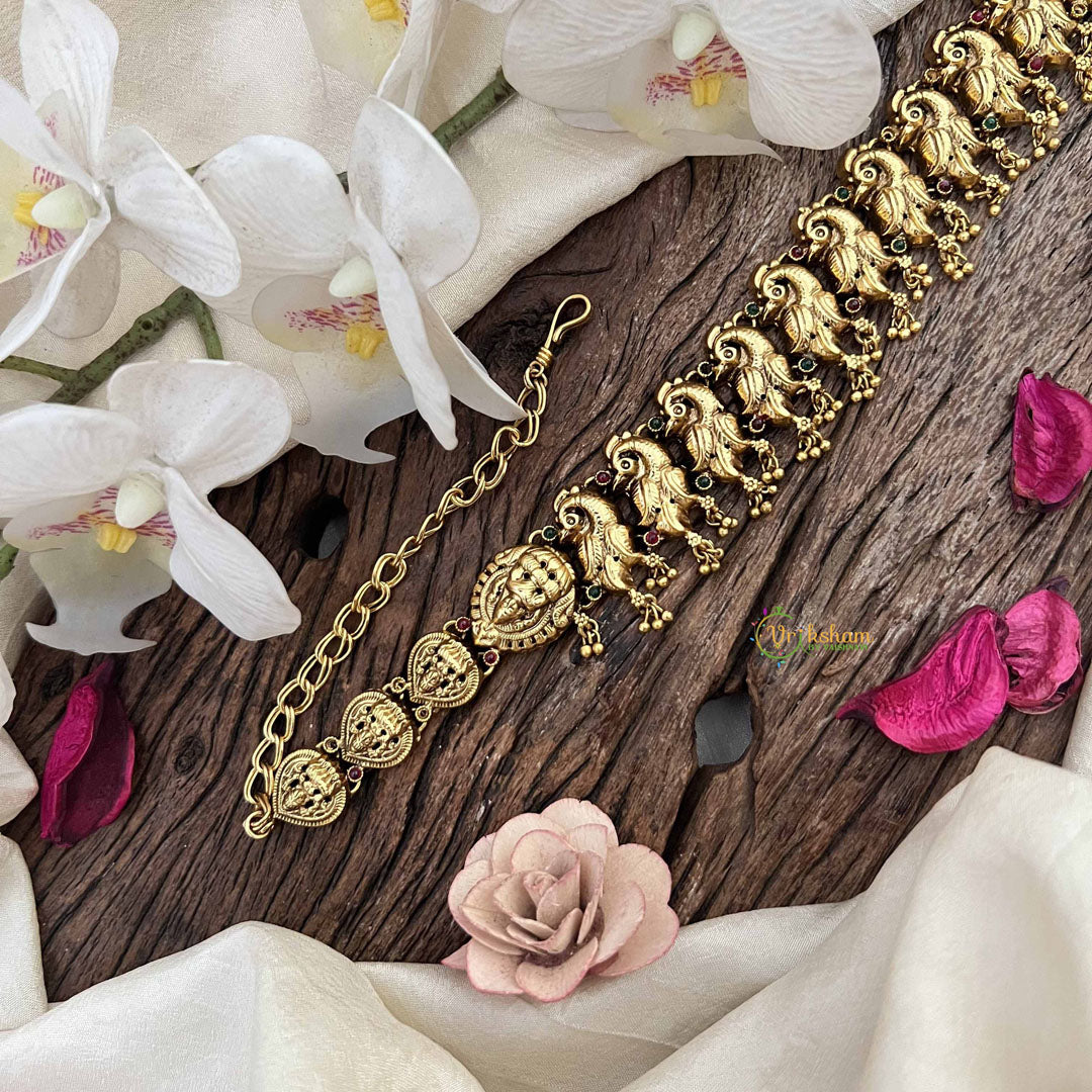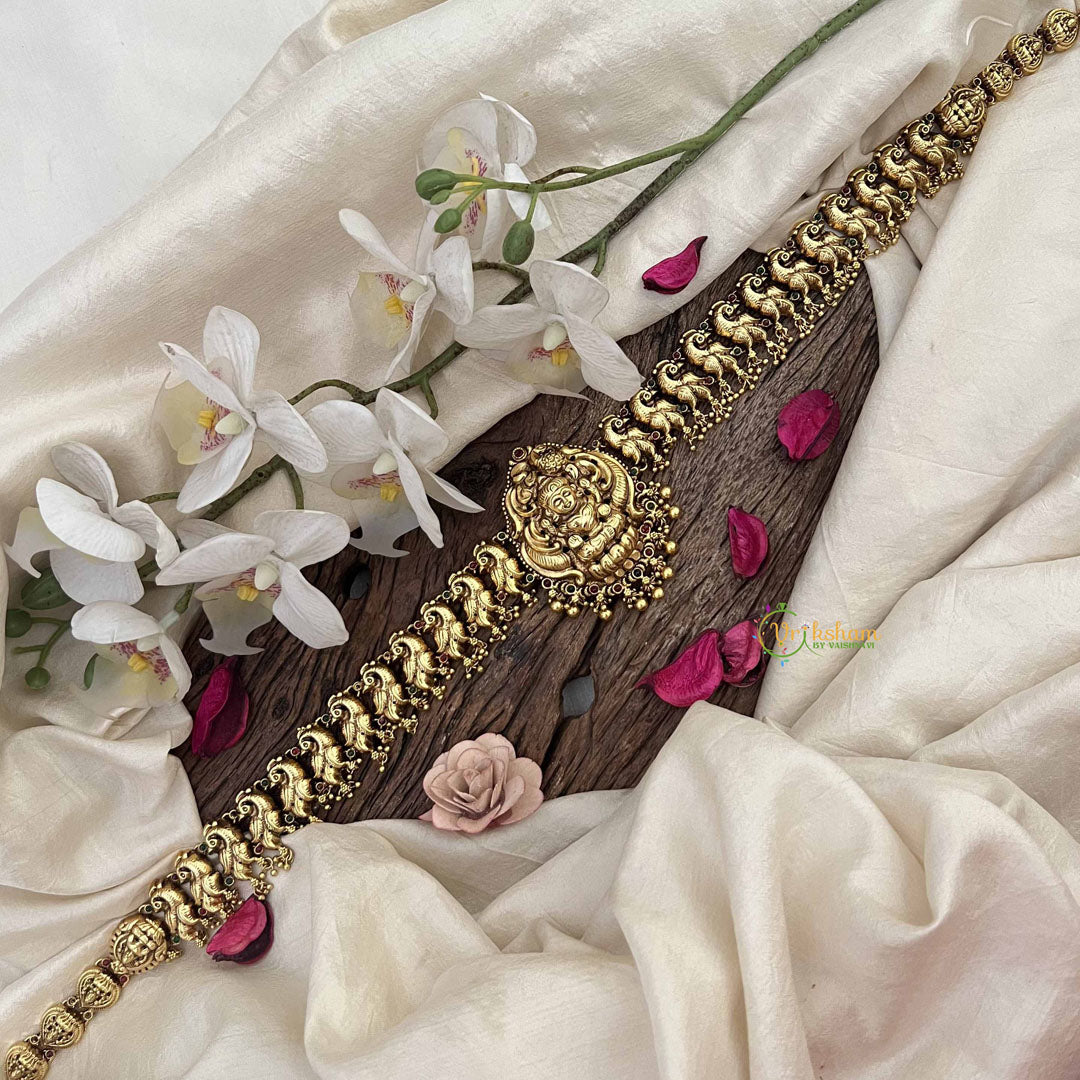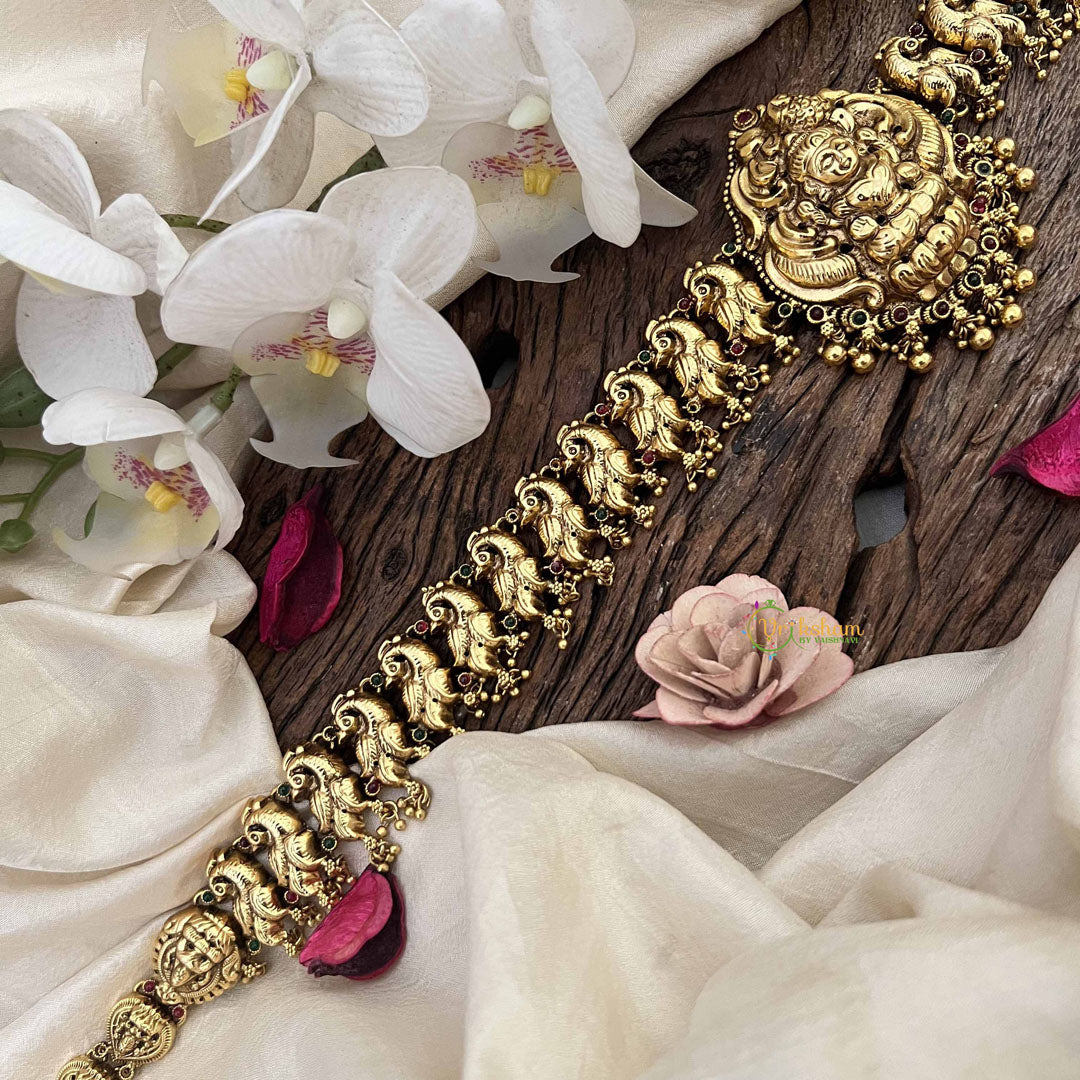 Embrace divine elegance with this classic peacock Lakshmi hipchain, a celebration of spiritual beauty and cultural richness. Vibrant green and red accents dance across the design, complemented by lustrous gold beads that catch light with mesmerizing brilliance. The peacock motif symbolizes grace and prosperity, while the Lakshmi inspiration evokes abundance and blessings. Each element is thoughtfully composed to create a harmonious accessory that honors tradition while maintaining contemporary appeal. Perfect for those who seek jewelry that transcends mere adornment, combining artistic expression with meaningful symbolism—an exceptional piece for celebrations and cherished moments.