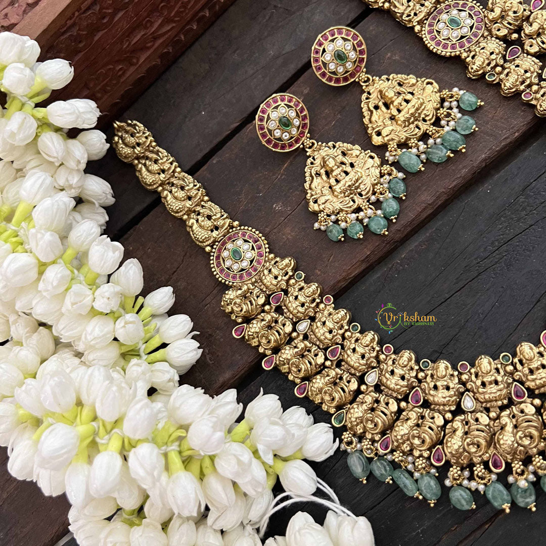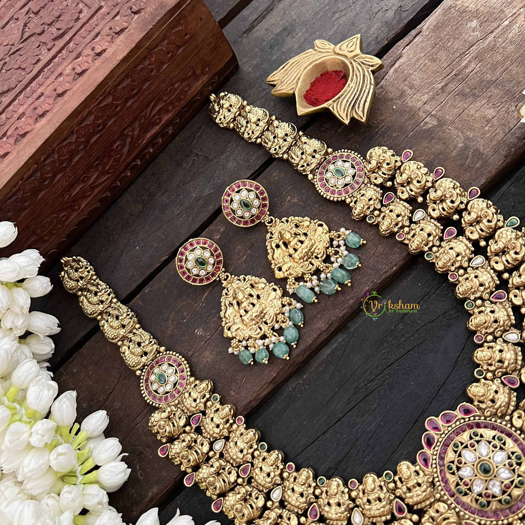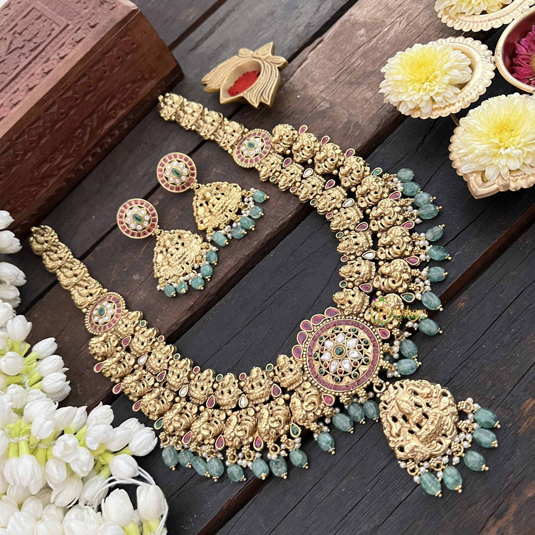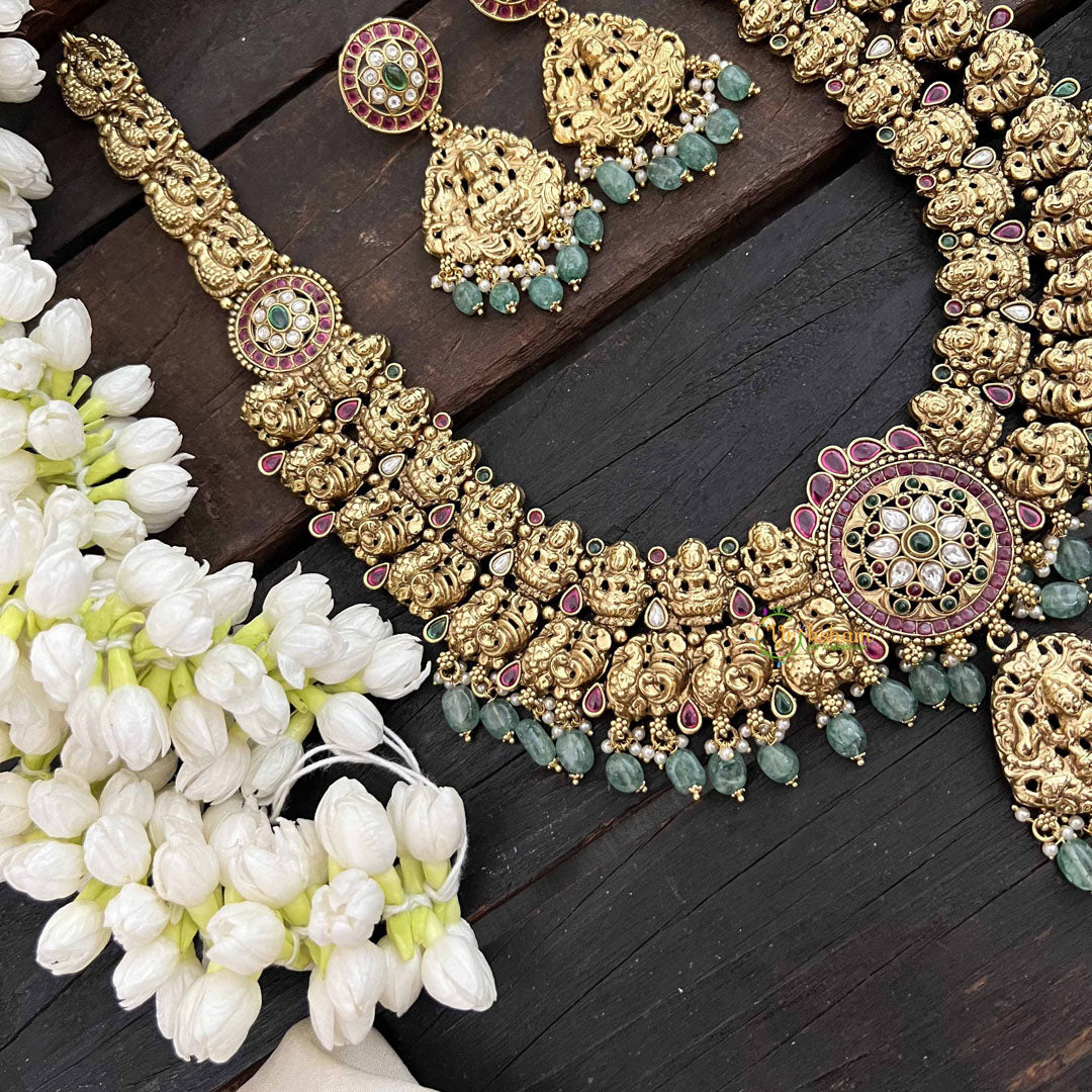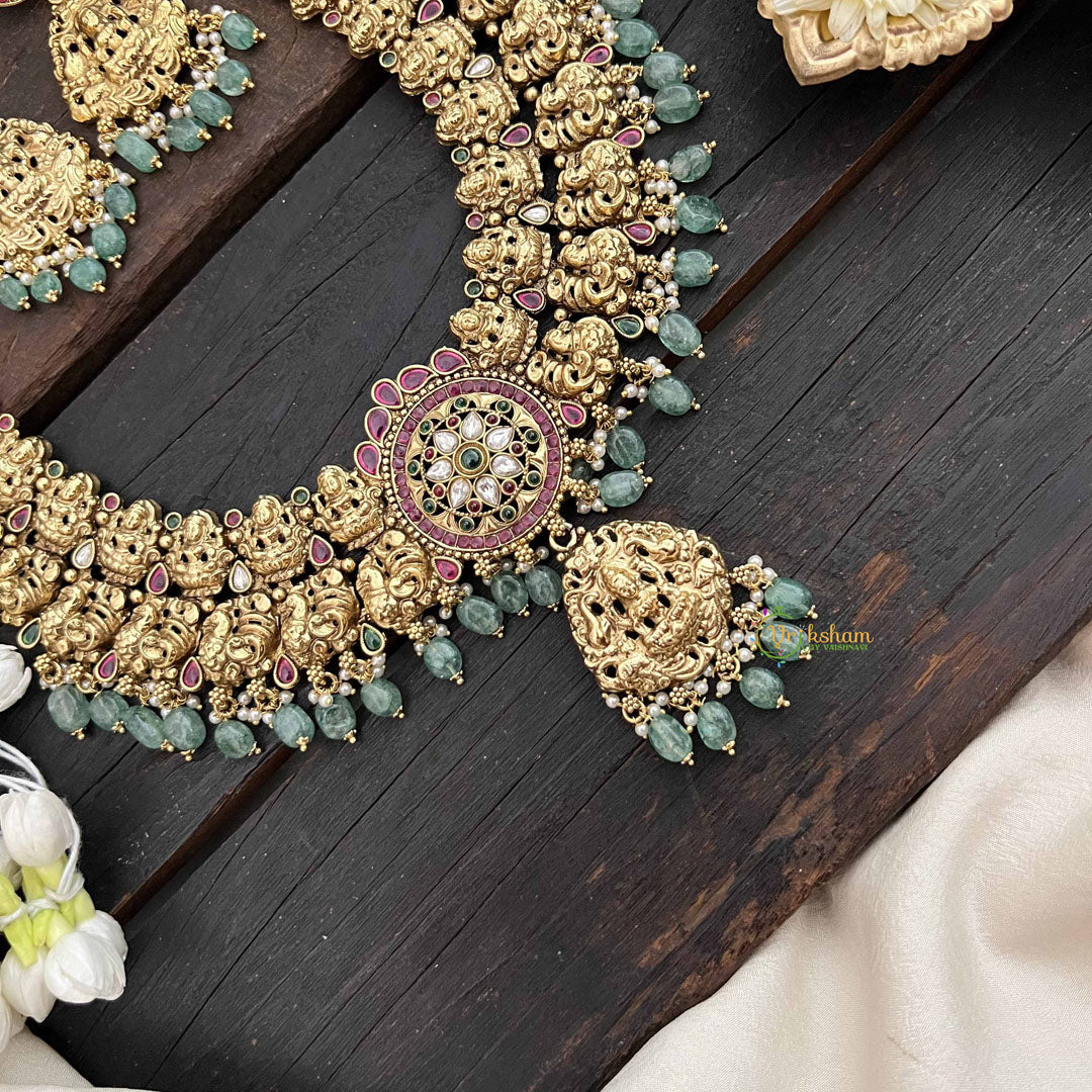 Embrace cultural richness with this magnificent long neckpiece featuring a classic peacock and Lakshmi pendant in vibrant red, white, and green tones, accented with verdant green beads. This thoughtfully designed piece merges auspicious symbolism with artistic elegance, creating a neckpiece that speaks to both tradition and refined taste. The extended length allows for graceful draping across traditional and contemporary ensembles alike. Perfect for weddings, festivals, and ceremonial occasions, this neckpiece celebrates prosperity and beauty through its intricate design, making it a cherished accessory for those who value meaningful jewelry with enduring cultural significance.