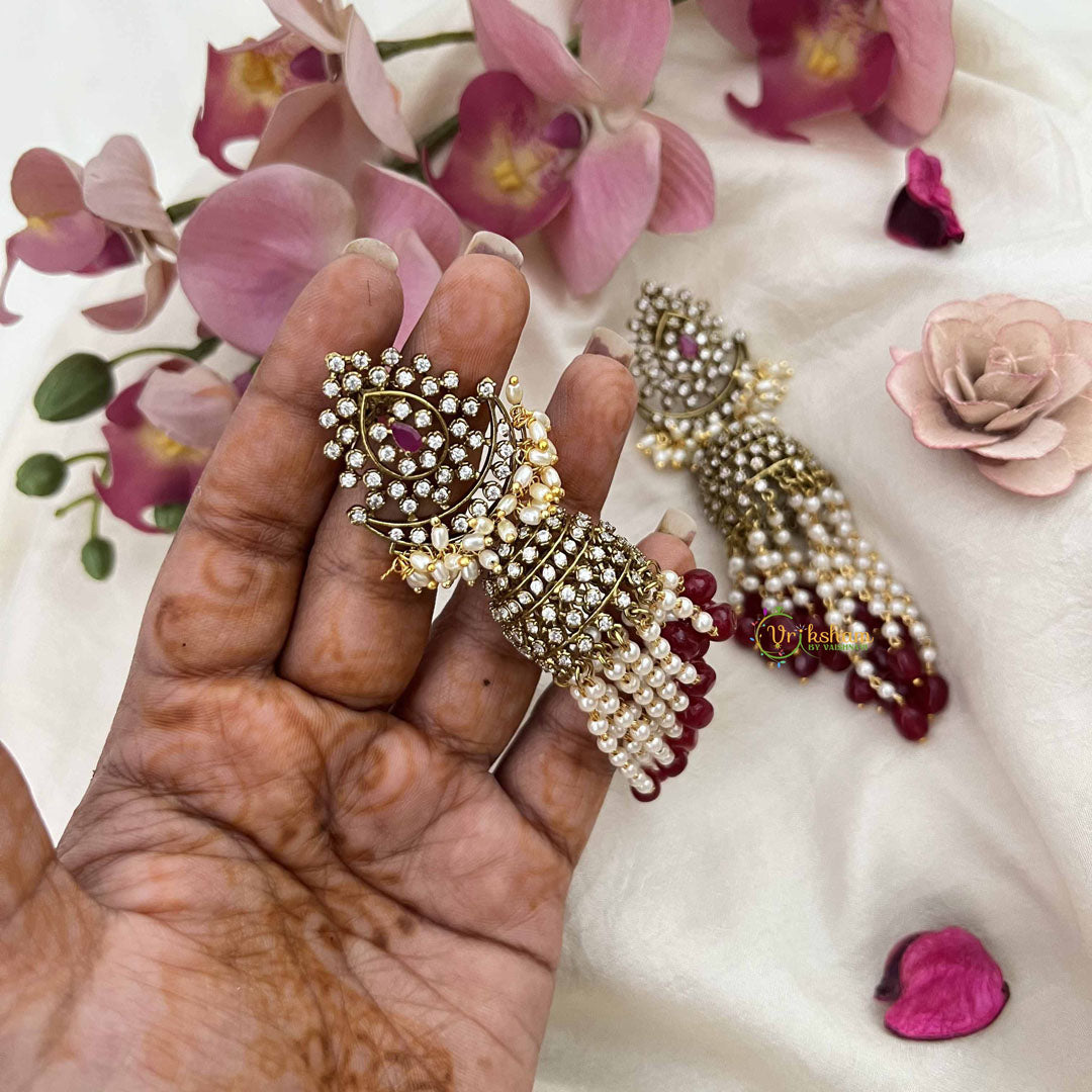 Discover timeless sophistication with these pear-shaped jhumka earrings, featuring a striking combination of lustrous rice pearls and vibrant red beads set against an ornate AD silver dome. The graceful pear silhouette creates an elegant drape, while the rich red accents add a bold pop of color that enhances traditional and contemporary outfits alike. Each earring showcases meticulous craftsmanship with American Diamond embellishments that sparkle with refined brilliance. Ideal for festive celebrations, weddings, or elevating your everyday elegance, these sophisticated jhumkas are a cherished addition to any jewelry wardrobe.