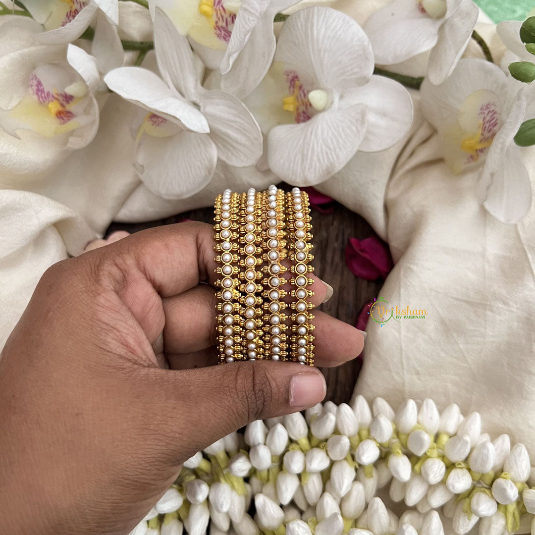Elevate your elegance with the Vriksham Classic Pearl Gold Bangles set. Featuring four exquisitely crafted bangles adorned with lustrous pearls, this collection seamlessly blends timeless charm with refined design. Perfect for enhancing both everyday ensembles and special occasions, these bangles offer a graceful statement of sophistication and style.
