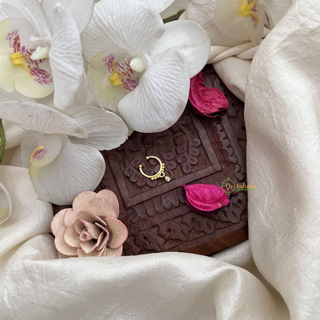 Elevate your traditional look with the Vriksham Classic Petite Gold Nath. This delicate Septum Ring features a refined design that adds subtle elegance to any ensemble. Crafted with precision, it offers a timeless charm perfect for special occasions or everyday grace. Its petite size ensures comfort while enhancing your natural beauty with a sophisticated touch.