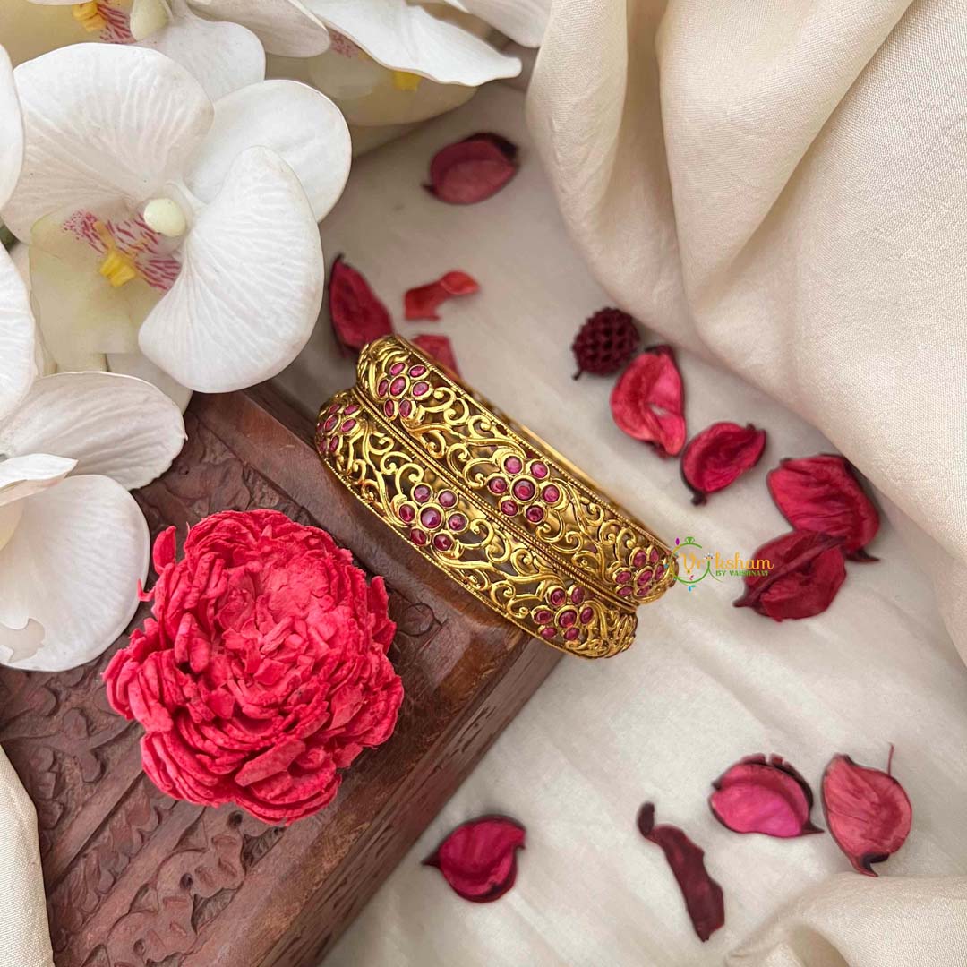 Elevate your traditional ensemble with these exquisite Classic Red Floral Golden Design Style Bangles. Crafted with meticulous attention to detail, each bangle features an intricate floral motif adorned with lustrous golden accents that beautifully complement the rich red finish. Perfect for weddings, festivals, or special occasions, these bangles seamlessly blend timeless elegance with contemporary sophistication. The harmonious interplay of vibrant red and gleaming gold creates a striking visual appeal that enhances any outfit. An ideal choice for those who appreciate refined craftsmanship and understated luxury in their jewelry collection.
