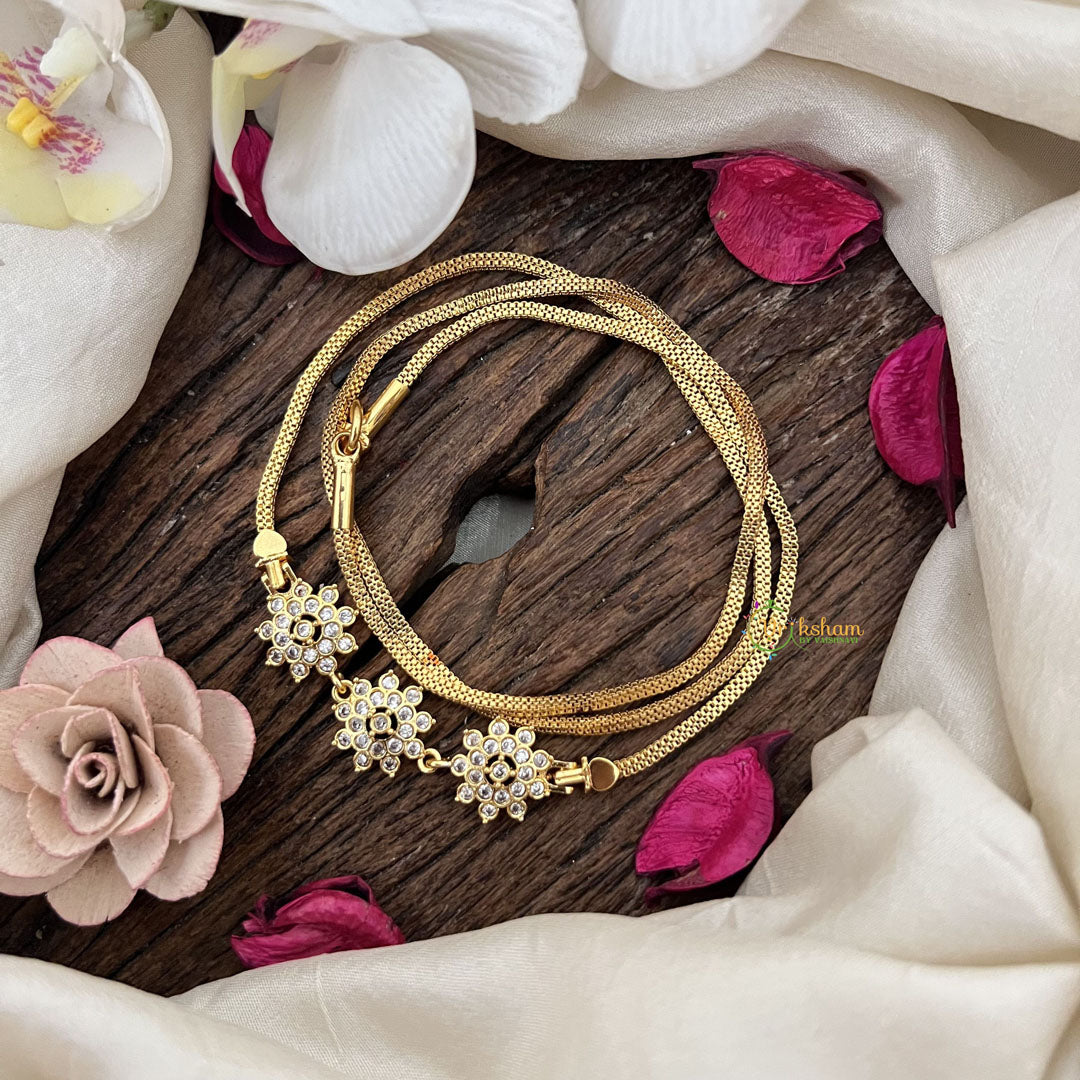 The Vriksham Classic South Indian Sun Floral Moggapu Gold Chain in white gold embodies timeless elegance with its intricate sun floral design. This sophisticated piece reflects traditional craftsmanship while offering a sleek, modern finish. Perfect for enhancing any ensemble, it brings a subtle yet striking touch of cultural heritage and refined style.