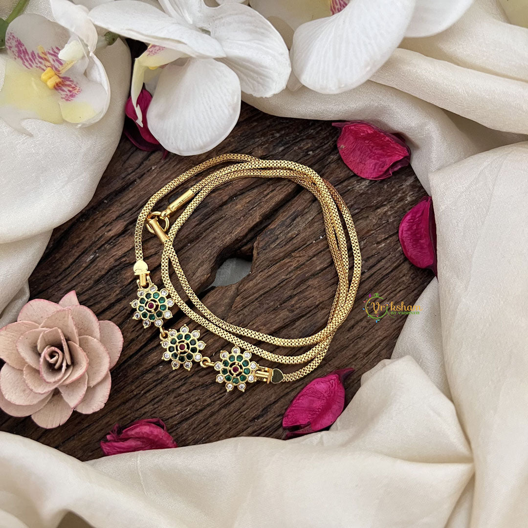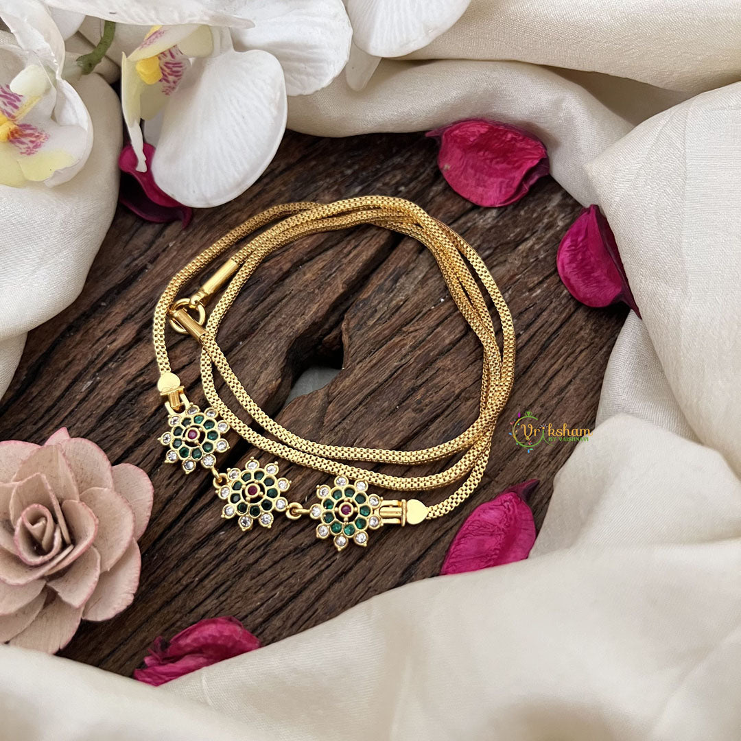 The Vriksham Classic South Indian Sun Floral Moggapu Gold Chain in white, red, and green gold showcases traditional craftsmanship with a sophisticated touch. Its intricate sun floral design reflects South Indian heritage, while the tri-color gold adds depth and elegance. This timeless piece is perfect for those seeking a refined accessory that honors cultural artistry with modern grace.