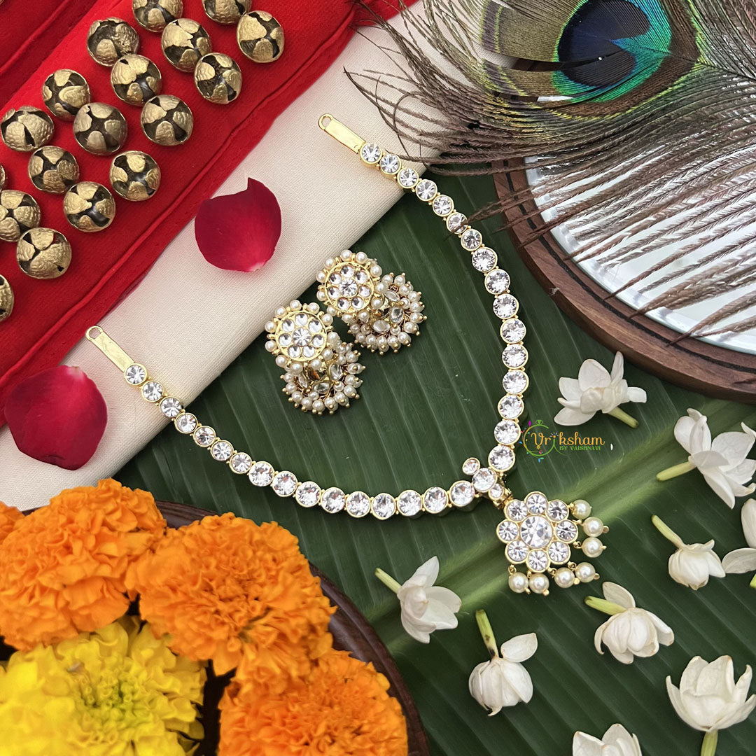 The Vriksham Classic Temple Round Design Attigai Style Short Neckpiece with pearls showcases timeless elegance through its traditional round temple motifs. Crafted in a classic Attigai style, this short neckpiece is delicately accented with pearls, adding a refined touch of sophistication. Perfect for enhancing formal attire, it embodies heritage and grace in every detail.