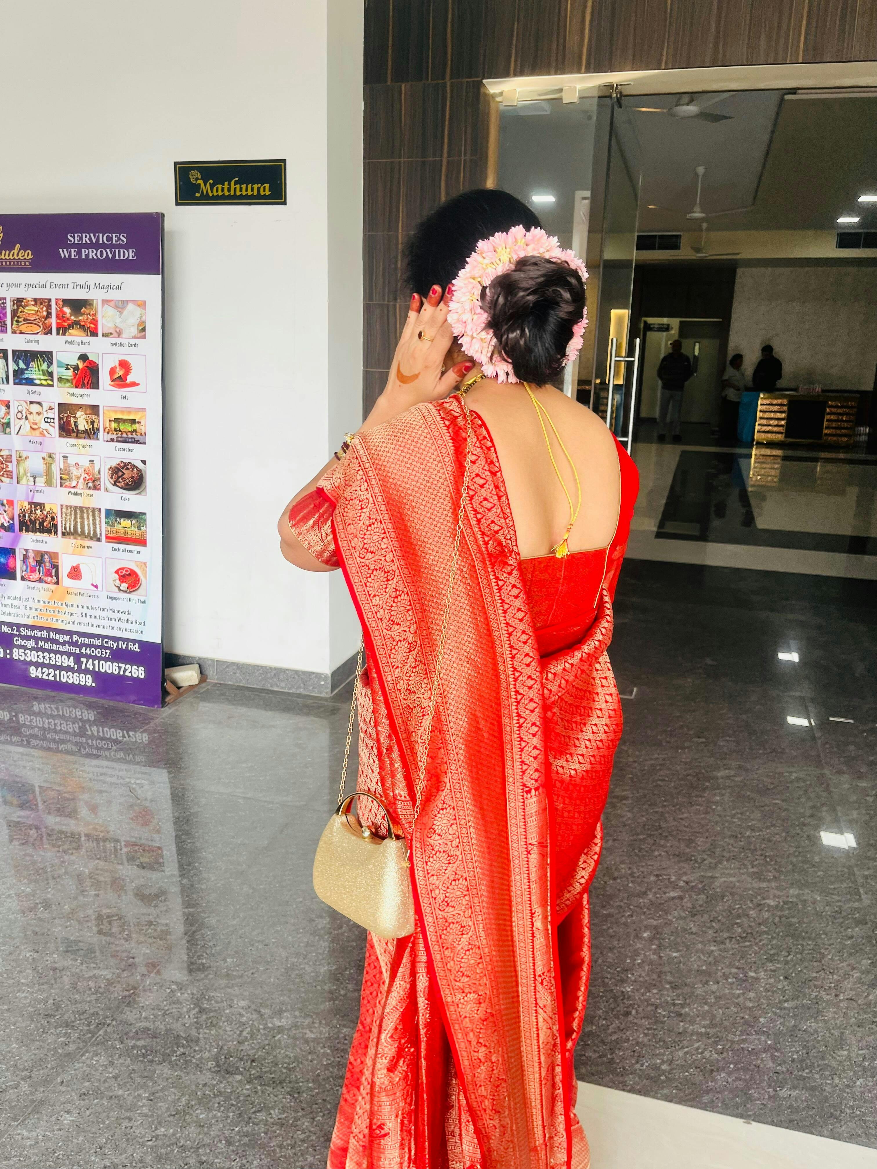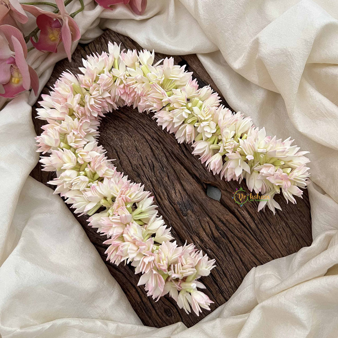 Capture timeless tradition with this Classic Temple Style ( jaathi malli) Jasmin Gajra, blending pristine white and soft pinkish hues. Carefully crafted to infuse your hairstyle with subtle fragrance and elegant charm, it is an ideal accessory for temple ceremonies and cultural events, enhancing your look with refined grace.Rest all crushable/ water proof / very very light weight/ long lasting foam flowers