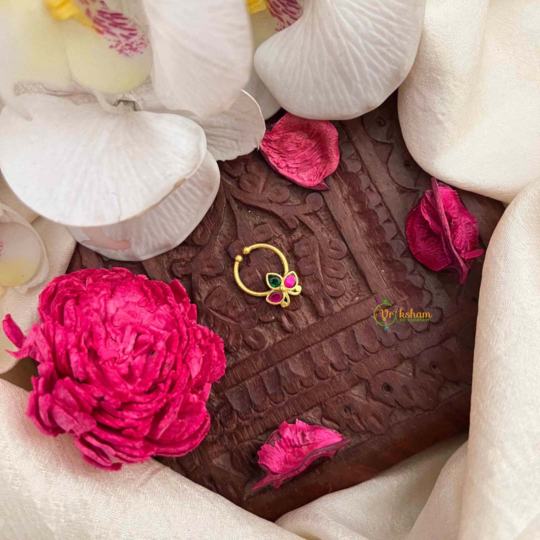 Embrace refined elegance with this classic three-leaf kundan jadau septum ring, a botanical-inspired design that marries nature with traditional craftsmanship. Featuring luminous green and red kundan stones intricately set in the timeless jadau technique, this piece exudes understated sophistication. The graceful leaf motif creates a harmonious composition that celebrates both artistic heritage and contemporary sensibility. Each stone is meticulously placed to catch light and enhance the jewel tones, resulting in a captivating accessory that speaks to your appreciation for fine artisanal work. An ideal choice for those seeking a septum ring that balances cultural authenticity with refined, enduring style.