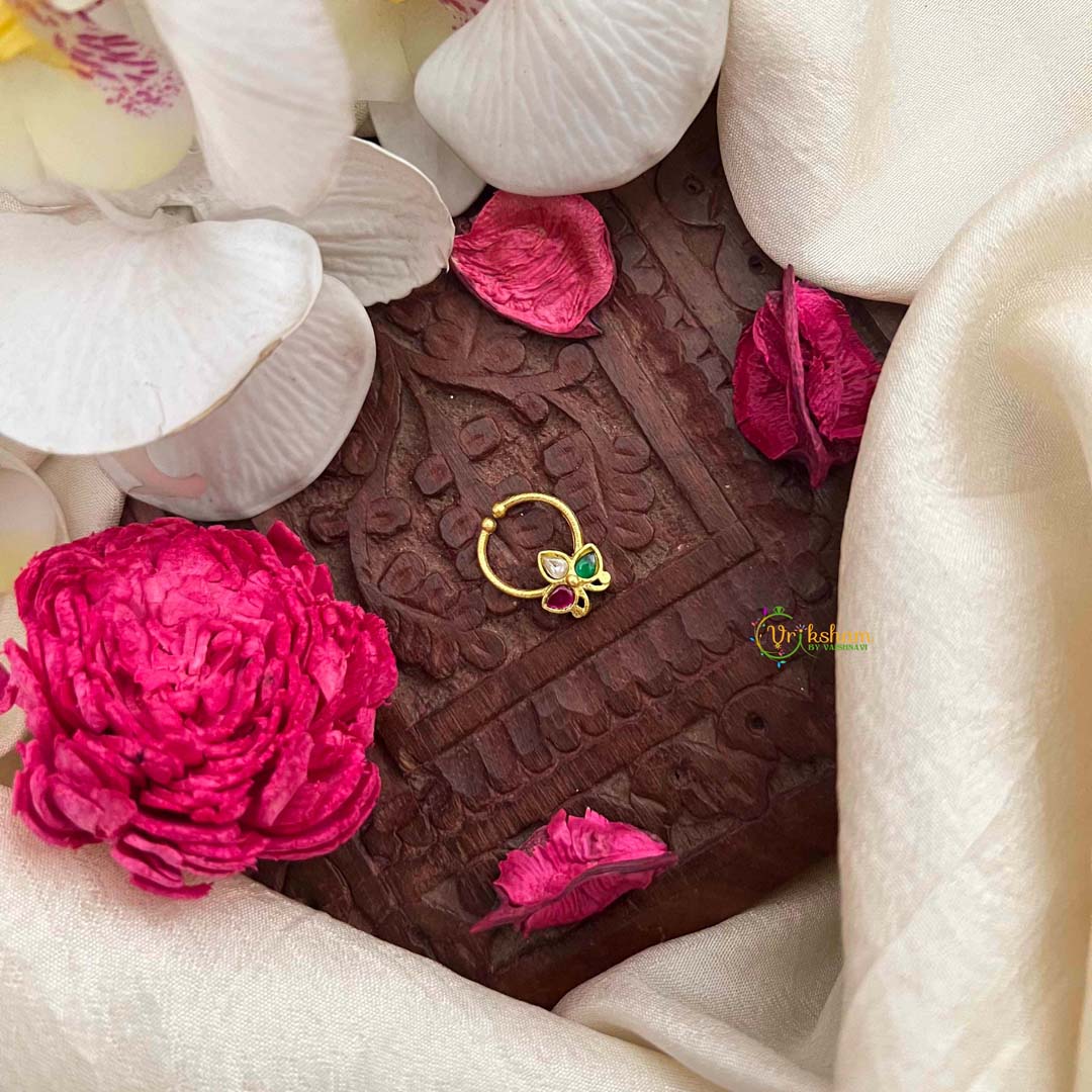 Celebrate timeless elegance with this classic three-leaf style kundan jadau septum ring, where nature-inspired design meets exceptional artistry. The delicate leaf motif frames vibrant green, red, and white kundan stones, each brilliantly set through intricate jadau craftsmanship. This sophisticated piece draws inspiration from botanical beauty while honoring traditional Indian jewelry-making heritage. The harmonious composition of jewel tones creates a refined aesthetic that commands attention without overwhelming the senses. Perfect for the discerning individual who appreciates understated luxury and meaningful design, this septum ring transforms your piercing into an elegant expression of cultural sophistication and personal style.