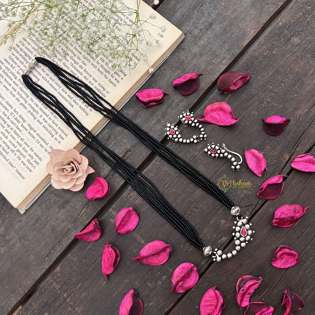 The Vriksham Classic Traditional Nath Silver Oxidized Pendant & Nath Magalsutra features a beautifully crafted oxidized silver pendant paired with a traditional Nath design, complemented by classic black beads. This sophisticated set elegantly combines timeless tradition with refined artistry, ideal for enhancing any cultural ensemble.