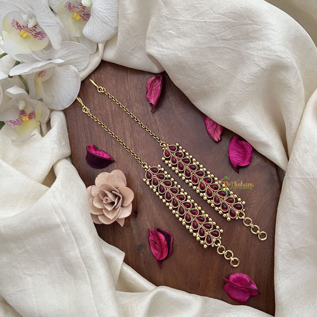 The Vriksham Clustered Ruby Kemp Ear Maatil in red features a striking arrangement of clustered Kemp stones that exudes refined elegance. Crafted to enhance traditional looks, this sophisticated accessory offers a bold yet graceful statement, perfect for adding rich color and timeless charm to your ensemble.