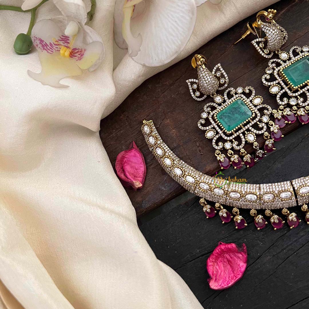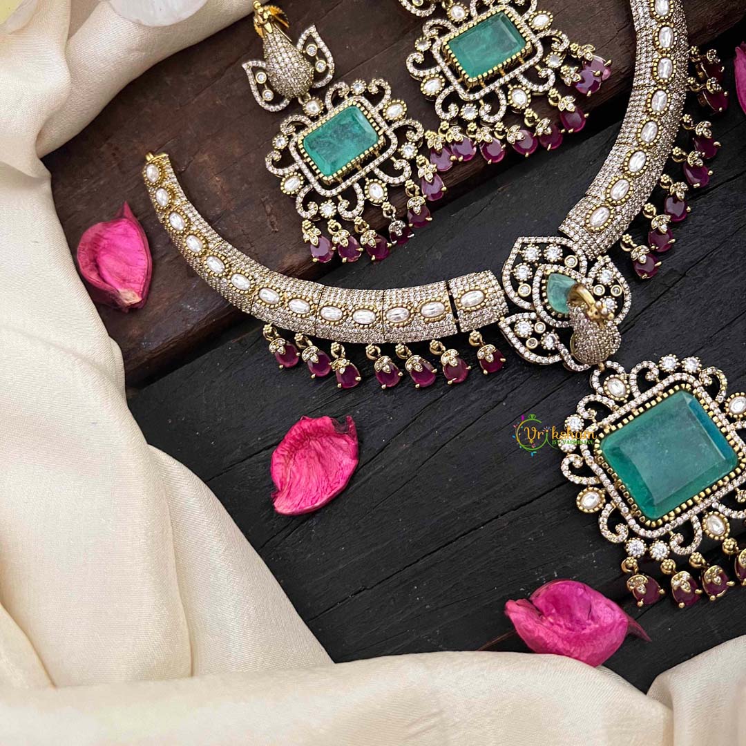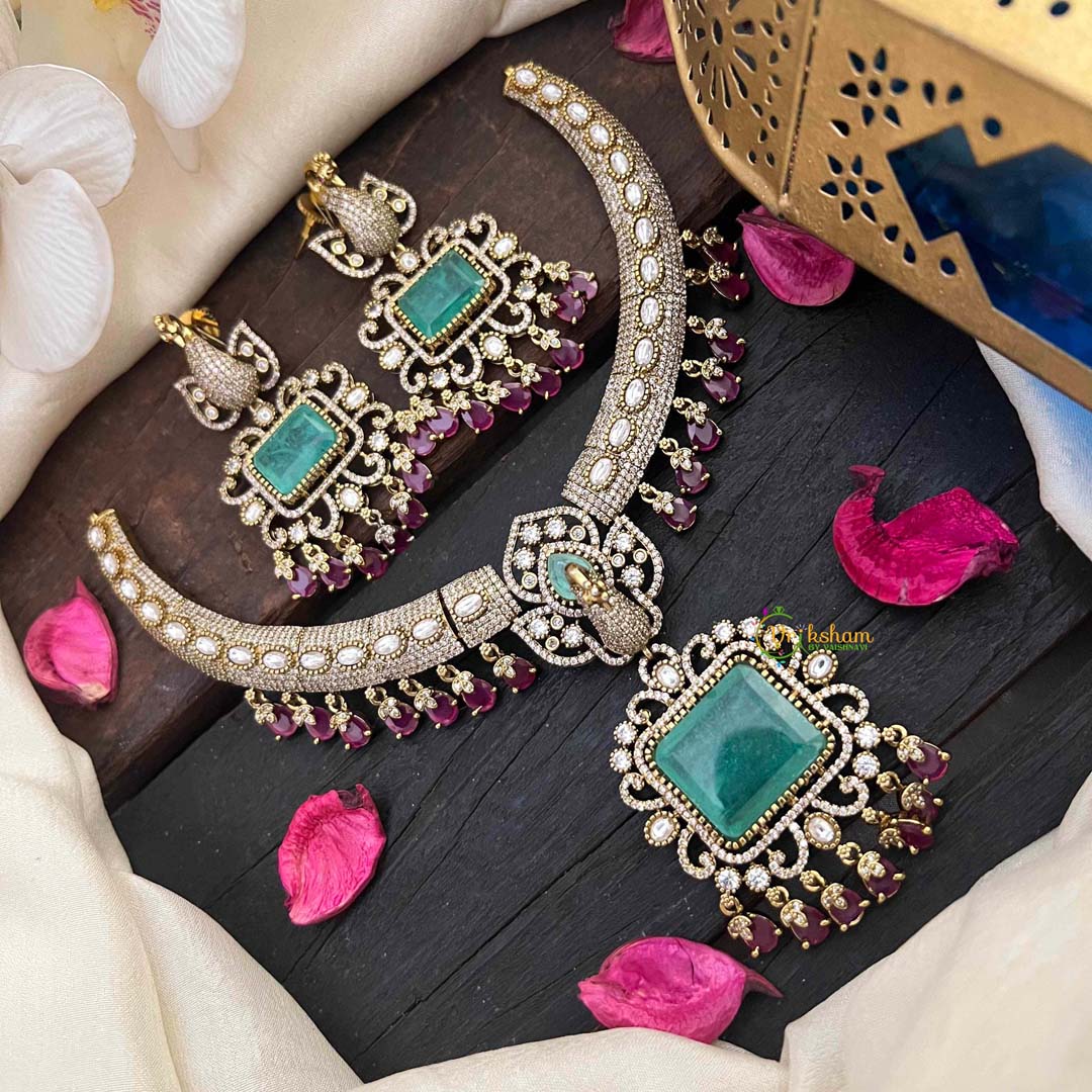 Embrace timeless elegance with this contemporary bridal hasli neckpiece, where Victorian-inspired design meets modern sophistication. The striking emerald centerpiece commands attention, beautifully complemented by sparkling AD zirconia stones that catch light with every movement. Crafted for the discerning bride who values both heritage and contemporary aesthetics, this statement piece transforms any bridal ensemble into a show-stopping look. Perfect for weddings, engagements, and special celebrations where refined glamour is essential.