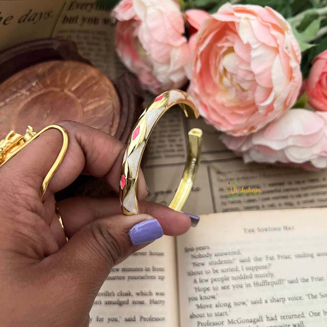 Captivate with this striking cream and pink kada bangle, showcasing a bold diamond pattern that exudes contemporary confidence. The geometric design is rendered in soft, complementary hues and finished with a lustrous gold-toned trim that elevates the overall aesthetic. Expertly crafted with enamel detailing, this stackable bangle seamlessly coordinates with coordinating pieces to create a curated wrist narrative. The harmonious color palette transitions effortlessly from casual moments to special occasions, offering versatility without compromise. A sophisticated statement piece that celebrates modern design sensibilities while honoring traditional jewelry craftsmanship.