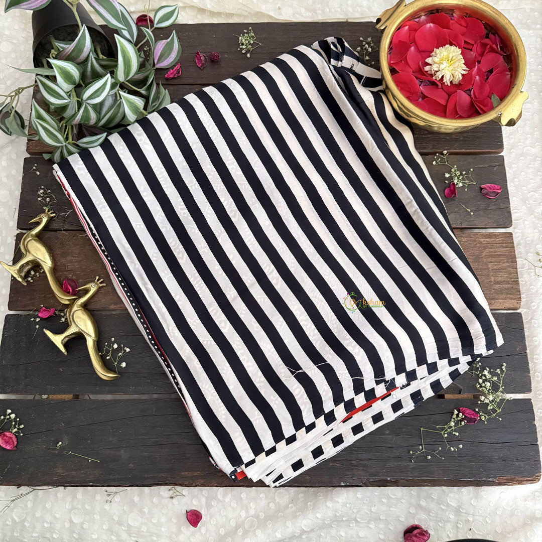 The Vriksham Cream With Black Striped Print Ajrakh Modal Silk Saree features a refined cream base accented with bold black stripes, crafted using traditional Ajrakh techniques on soft modal silk. Its elegant drape and smooth texture make it an excellent choice for sophisticated occasions, blending classic design with contemporary grace.