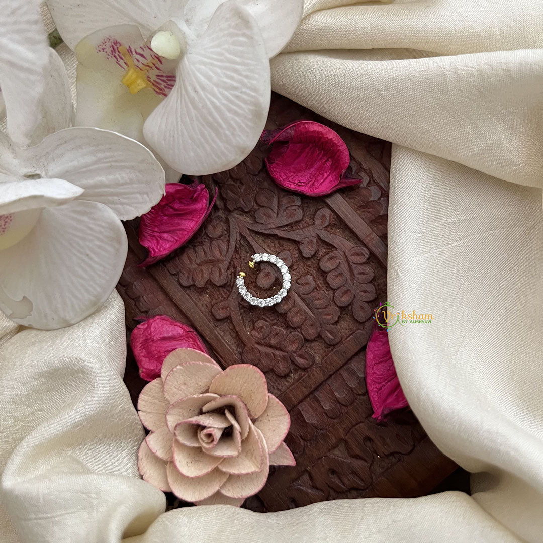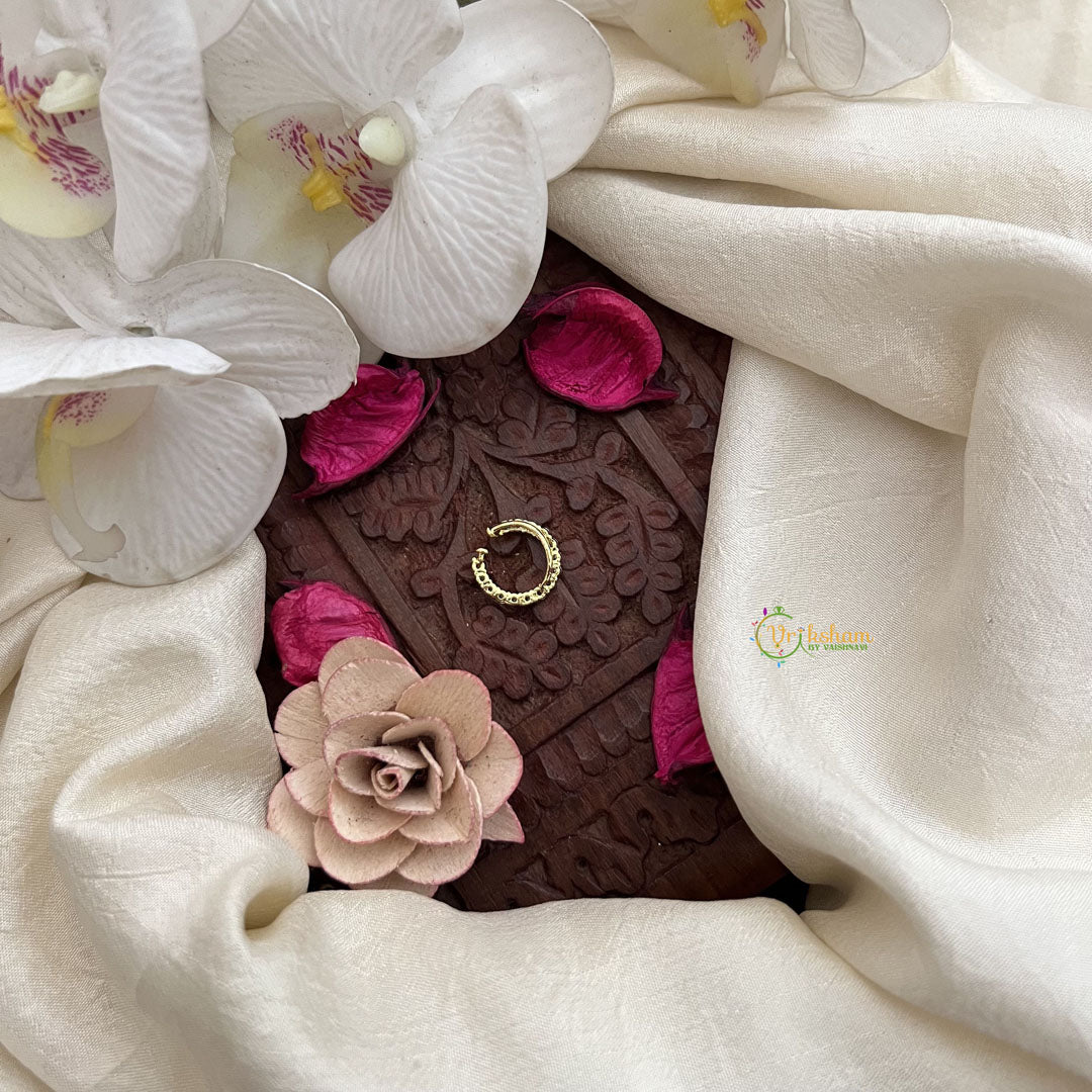 Elevate your traditional look with the Vriksham Crescent AD Stones Press Naths. Expertly crafted, this nose pin features exquisite crescent-shaped design adorned with sparkling AD stones, offering a refined touch of elegance. Its secure press-fit ensures comfortable wear throughout the day, making it a perfect accessory for both festive occasions and everyday grace.