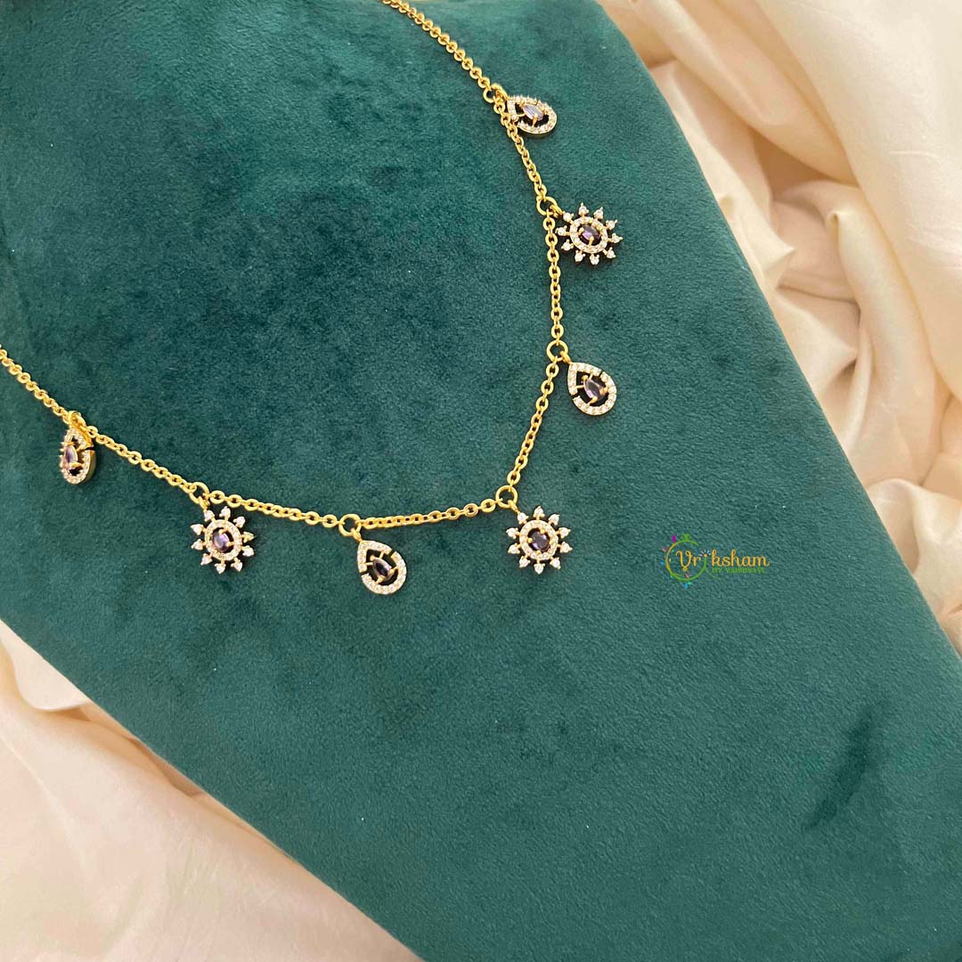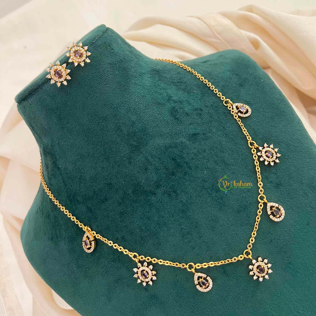 Unveil your refined taste with this captivating purple cubic zirconia jewelry set, featuring an intricate sunburst charm pendant paired with delicate teardrop accents. The sunburst design radiates with prismatic brilliance, while the graceful teardrop elements add sophisticated movement and visual interest. Completed by matching stud earrings, this ensemble delivers a cohesive, polished presentation. The regal purple tone exudes elegance and poise, making it an exceptional choice for those who appreciate jewelry that combines artistic design with timeless appeal. Ideal for elevating both formal occasions and refined everyday styling.