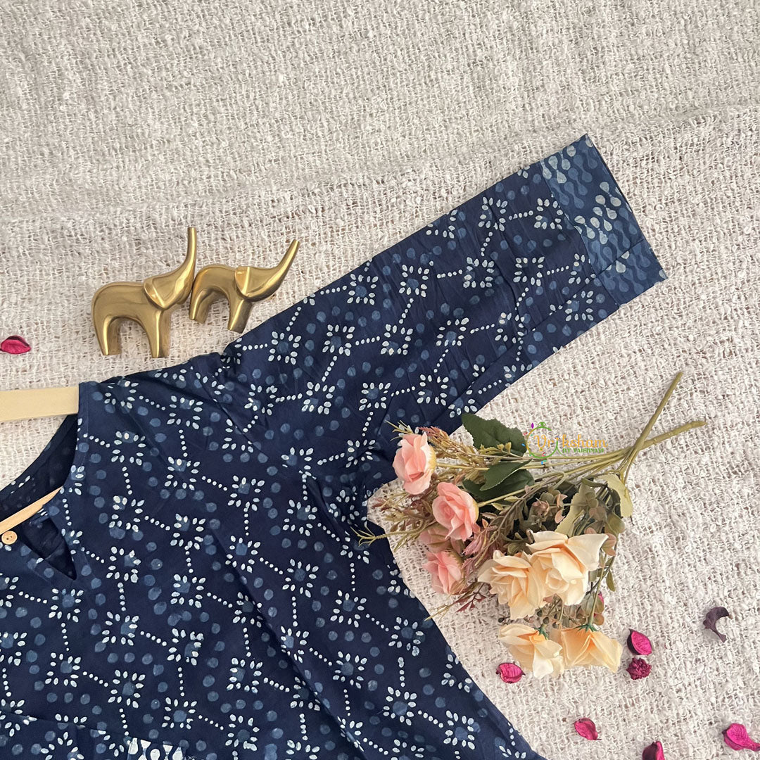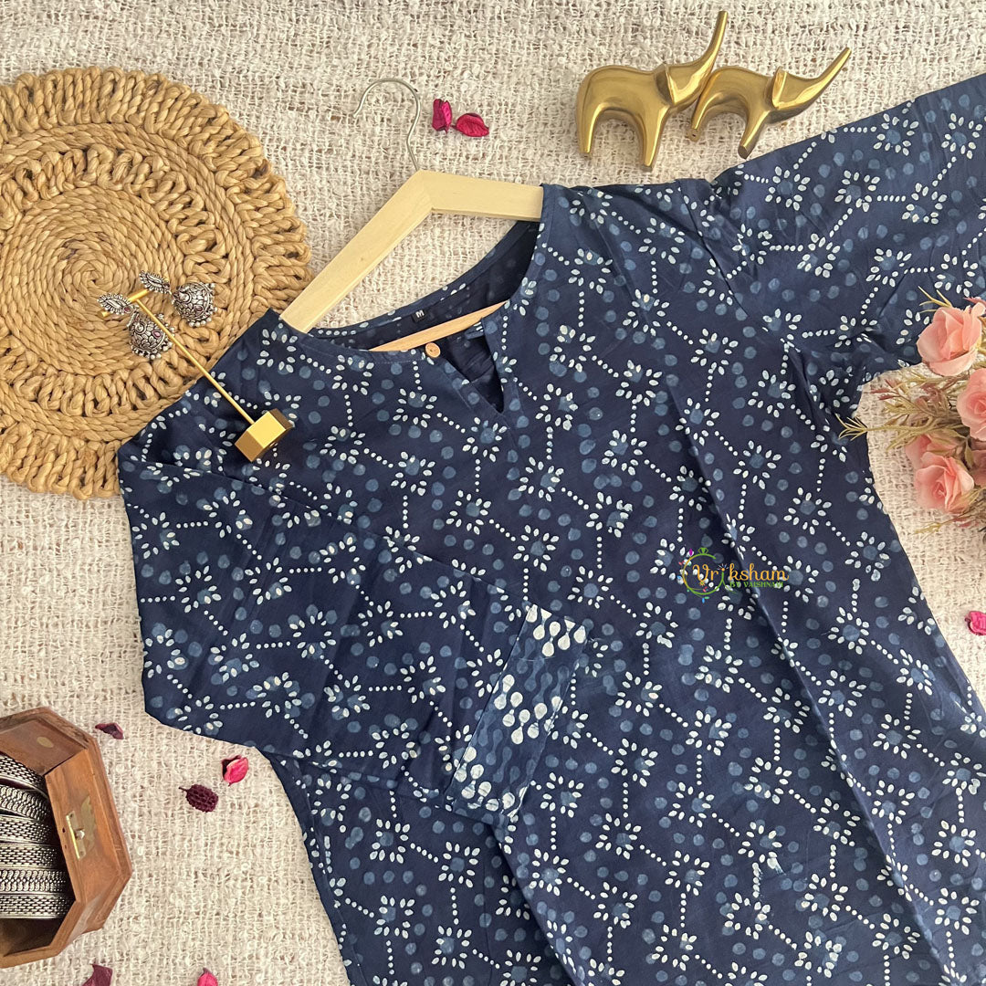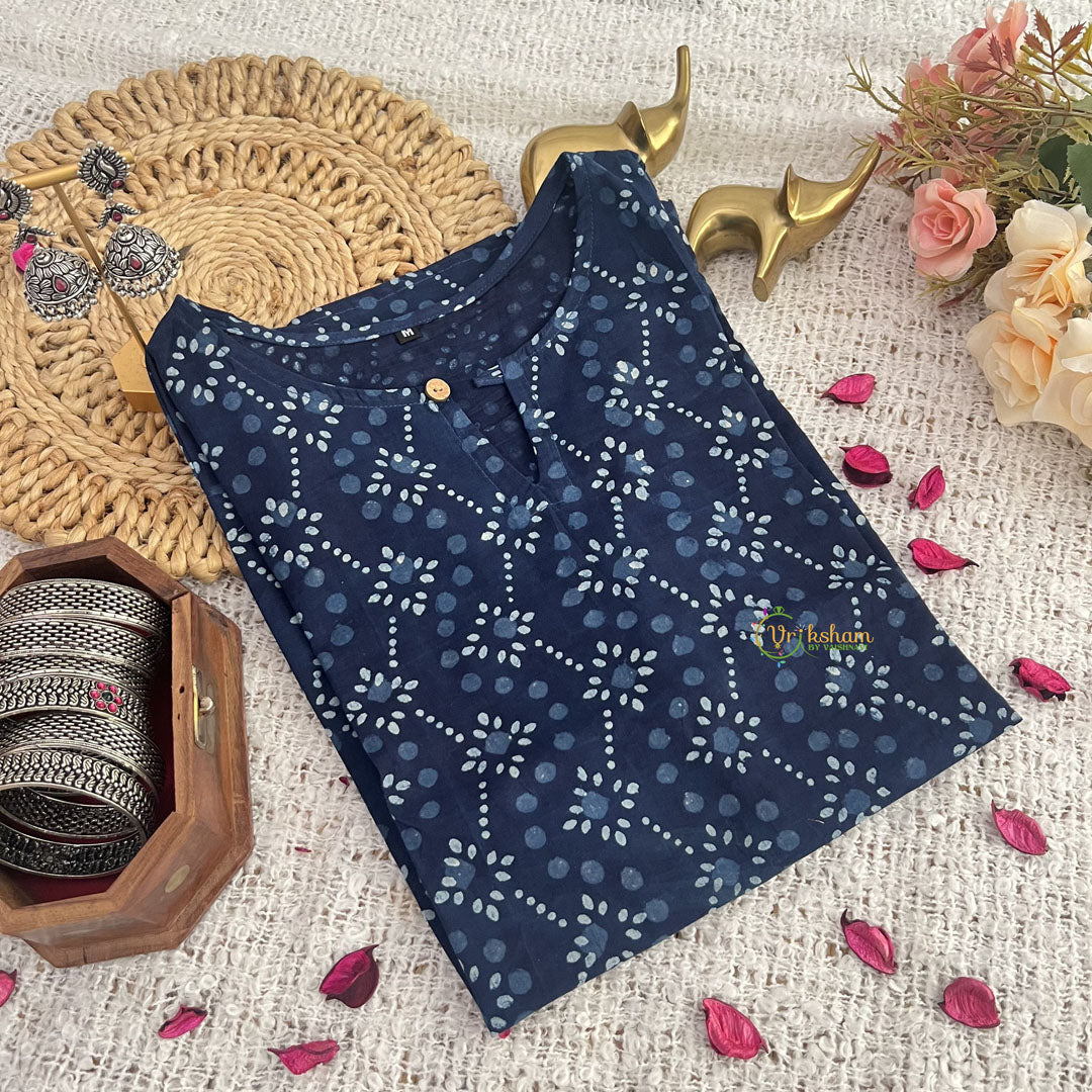 Introducing Vriksham Dark Blue Handbloack Cotton Short Kurti, the perfect blend of style and comfort. Made with 100% cotton and handblock printing, this elegant 3/4 sleeve kurti is suitable for both daily wear and office wear. Elevate your wardrobe with this luxurious piece and make a statement wherever you go.
