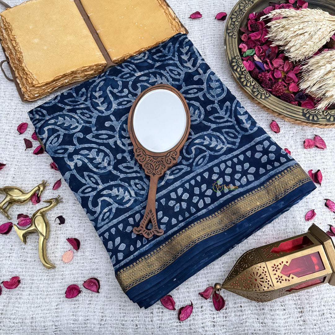 Exquisite Dark Blue Printed Maheshwari Cotton Silk Saree, meticulously handcrafted on traditional handlooms. This lightweight blend of cotton and silk offers exceptional breathability and a subtle sheen, making it the perfect choice for summer elegance. The distinctive leaf print pattern showcases artisanal craftsmanship while providing sophisticated comfort for both casual gatherings and formal occasions.