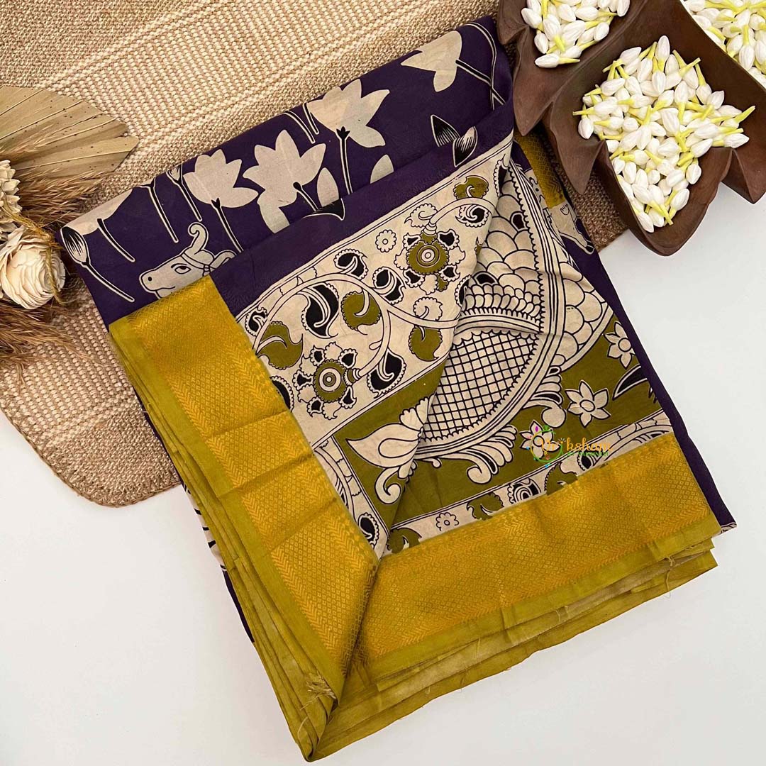 Discover profound elegance in this extraordinary Kalamkari saree, rendered in deep indigo that evokes timeless mystique and cultural reverence. Sacred Kamadhenu motifs intertwine with delicate florals, each element meticulously hand-painted to showcase the unparalleled artistry of traditional Kalamkari craftsmanship. The resplendent golden zari Nizam border—a signature of Hyderabadi heritage—bestows regal magnificence and distinguished prestige upon the composition. Perfect for auspicious occasions, formal celebrations, and moments demanding profound elegance, this saree transcends seasonal trends. An heirloom-quality investment that honors India's spiritual and artistic legacy while offering the discerning collector a garment of exceptional cultural significance and enduring, sophisticated beauty.