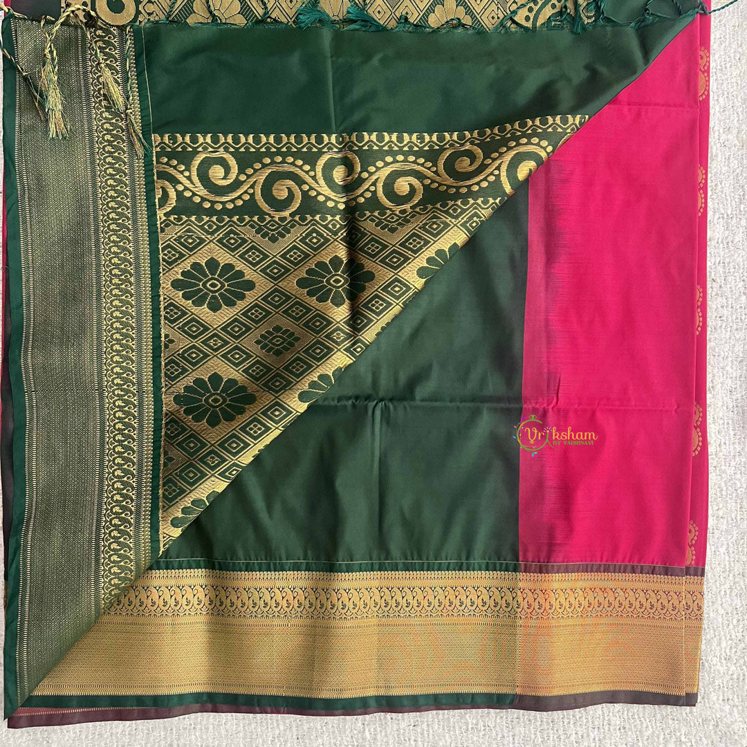 Embrace regal sophistication with this stunning semi-soft silk saree in deep pink, embellished with magnificent peacock-inspired golden butta motifs and elaborate zari work adorning a verdant green border. The opulent detailing reflects masterful traditional artistry and authentic weaving heritage. Designed for the discerning individual, this saree effortlessly commands presence at festive celebrations and formal occasions. The premium semi-soft silk fabric offers a graceful, luxurious drape while maintaining exceptional resilience and structural integrity. A distinguished selection that celebrates cultural authenticity while embracing refined aesthetic sensibilities with understated confidence and enduring splendor.