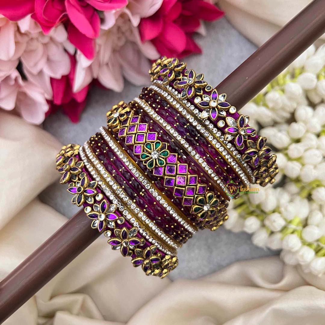 Elevate your ethnic ensemble with this exquisite bangle set featuring deep plum and emerald green hues. Each of the 15 pieces showcases intricate floral kundan work paired with a distinctive side kada style, crafted from premium glass for durability and radiance. The sophisticated color palette complements traditional and contemporary wear alike, while the kundan embellishments add timeless elegance and sparkle. Perfect for weddings, festivals, or special occasions, this versatile collection allows you to mix and match for personalized styling. A statement piece that celebrates craftsmanship and refined taste.