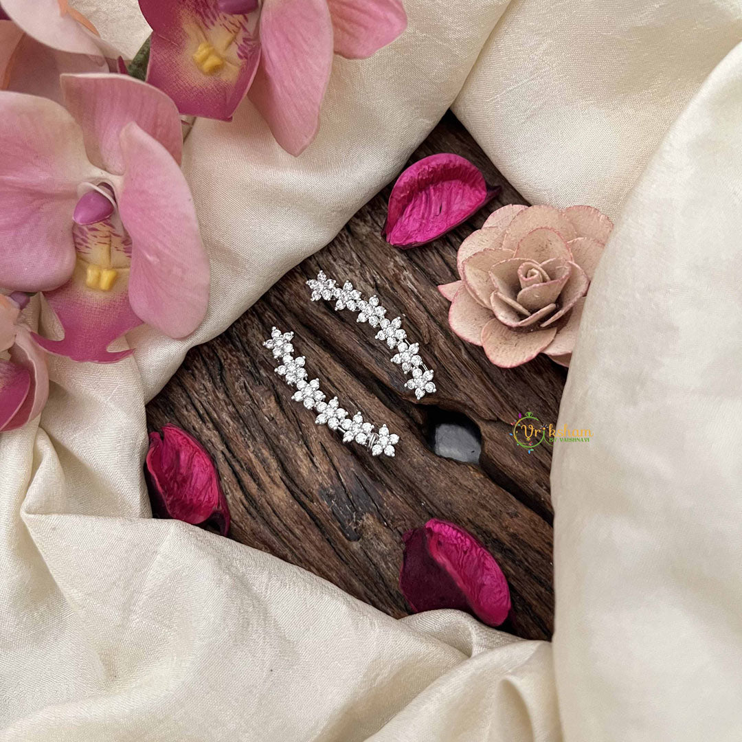 The Vriksham Delicate Flower Ear Cuffs showcase a refined silver design accented with radiant white stones, forming an elegant floral motif. These minimalist ear climbers offer a sophisticated sparkle, perfect for adding subtle glamour to both everyday attire and special occasions.