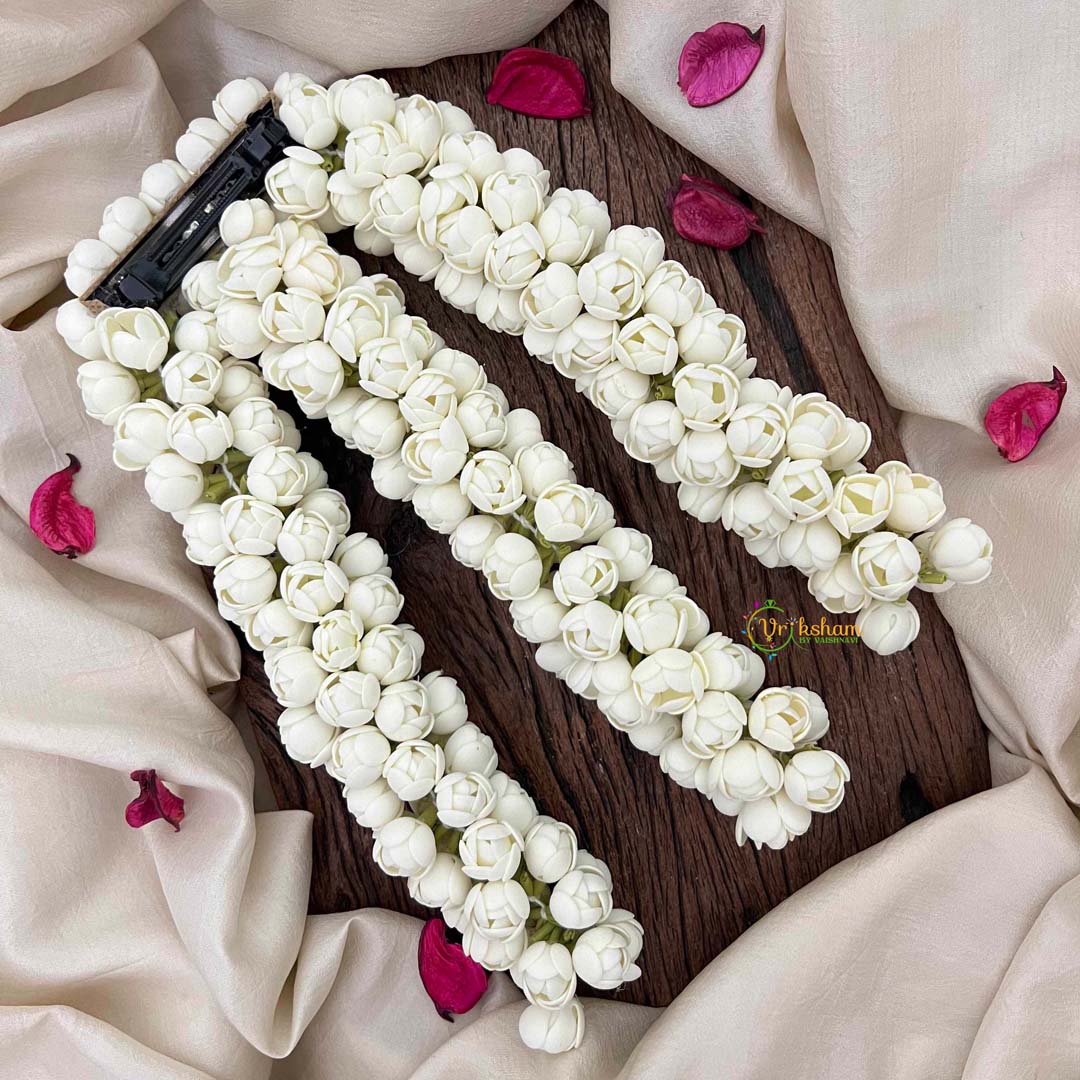 Elevate your braided hairstyles with this deluxe triple strand artificial jasmine braid extension, a premium accessory crafted for refined styling versatility. Featuring three intricately woven strands adorned with lifelike jasmine blooms, this piece brings botanical elegance and dimensional sophistication to traditional and contemporary braids. The secure attachment mechanism ensures reliable placement while maintaining natural movement and comfort throughout the day. Perfect for weddings, celebrations, or those seeking to enhance their aesthetic with enduring floral artistry, it offers lasting beauty without seasonal constraints. Each piece reflects exceptional craftsmanship and superior construction quality. A distinguished selection for those who appreciate premium botanical design and desire accessories that honor tradition while delivering lasting refinement, visual complexity, and graceful sophistication.