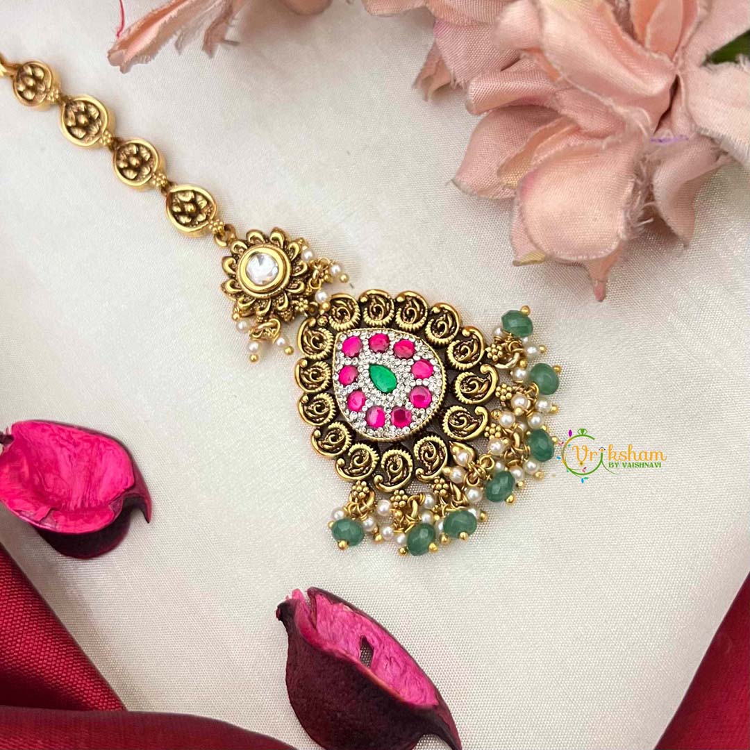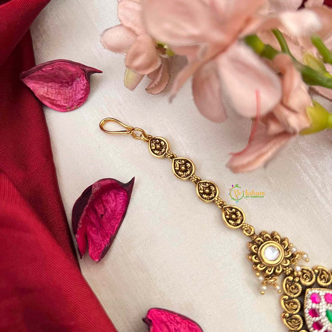 Captivate with this elegant pear-style kundan jadau maang tikka, a refined interpretation of classical jewelry design. The graceful pear motif showcases exceptional kundan craftsmanship, adorned with rich red and vibrant green gemstones that radiate timeless beauty. The lustrous gold finish provides a warm, luxurious backdrop that enhances every facet of the design. Complemented by delicate green bead accents, this sophisticated piece strikes a perfect balance between traditional artistry and contemporary elegance.