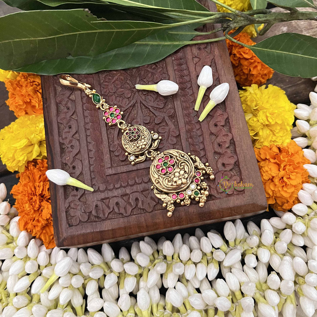 The Vriksham Designer 1 Gram Gold Maang Tikka showcases intricate craftsmanship with a delicate 1 gram gold finish. This elegant and lightweight accessory is designed to add a refined, sophisticated touch to bridal or traditional hairstyles, enhancing your overall look with timeless grace