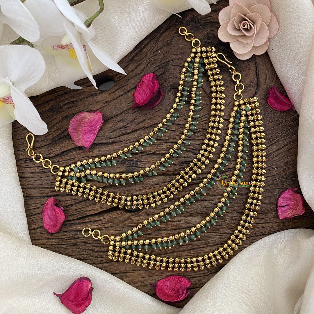 Indulge in luxury with Vriksham's elegant designer gold look alike maatil/ear chain. With three layers of intricate detailing, this accessory adds a touch of sophistication to any outfit. Made with premium materials, it's a perfect addition for those who appreciate exclusivity. Elevate your style with Vriksham.