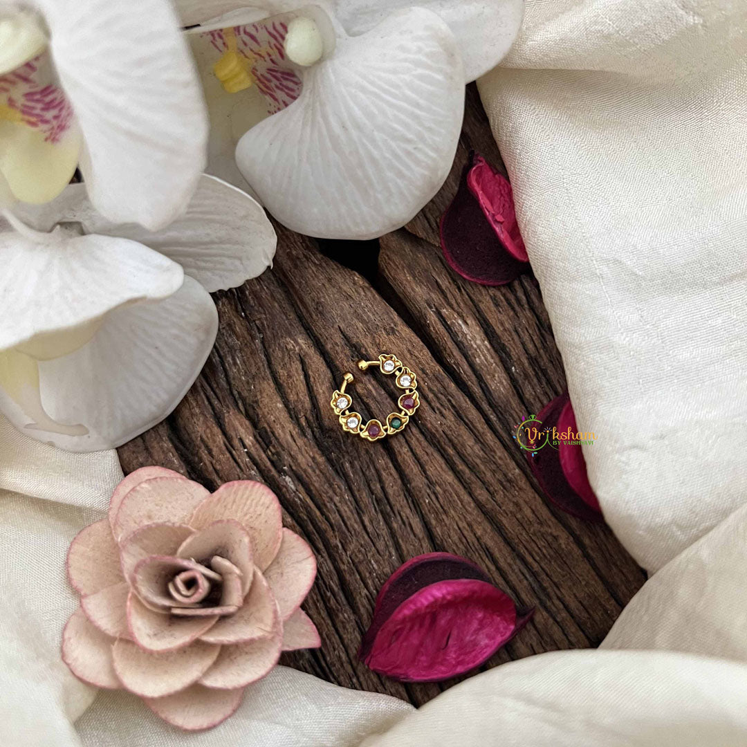 The Vriksham Designer 7 Floral Septum Ring in a gold-toned finish features a sophisticated arrangement of red, green, and white Kundan stones. This beautifully detailed piece merges classic floral motifs with vibrant hues, offering a refined accessory that enhances any look with grace and charm. Crafted for comfort and style, it is an exquisite choice for those seeking a distinctive and elegant statement.