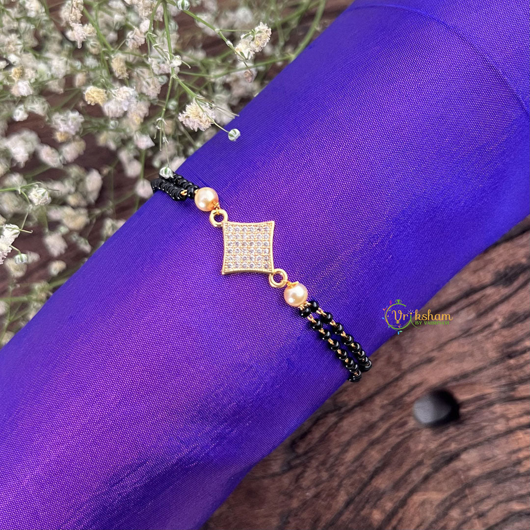 The Vriksham Designer AD Stone Diamond Shape Mangalsutra Bracelet features elegant diamond-shaped AD stones arranged to create a refined and striking design. This bracelet seamlessly blends traditional symbolism with contemporary style, making it an exquisite accessory for both festive occasions and everyday sophistication. Its polished craftsmanship adds a subtle sparkle that enhances any ensemble.