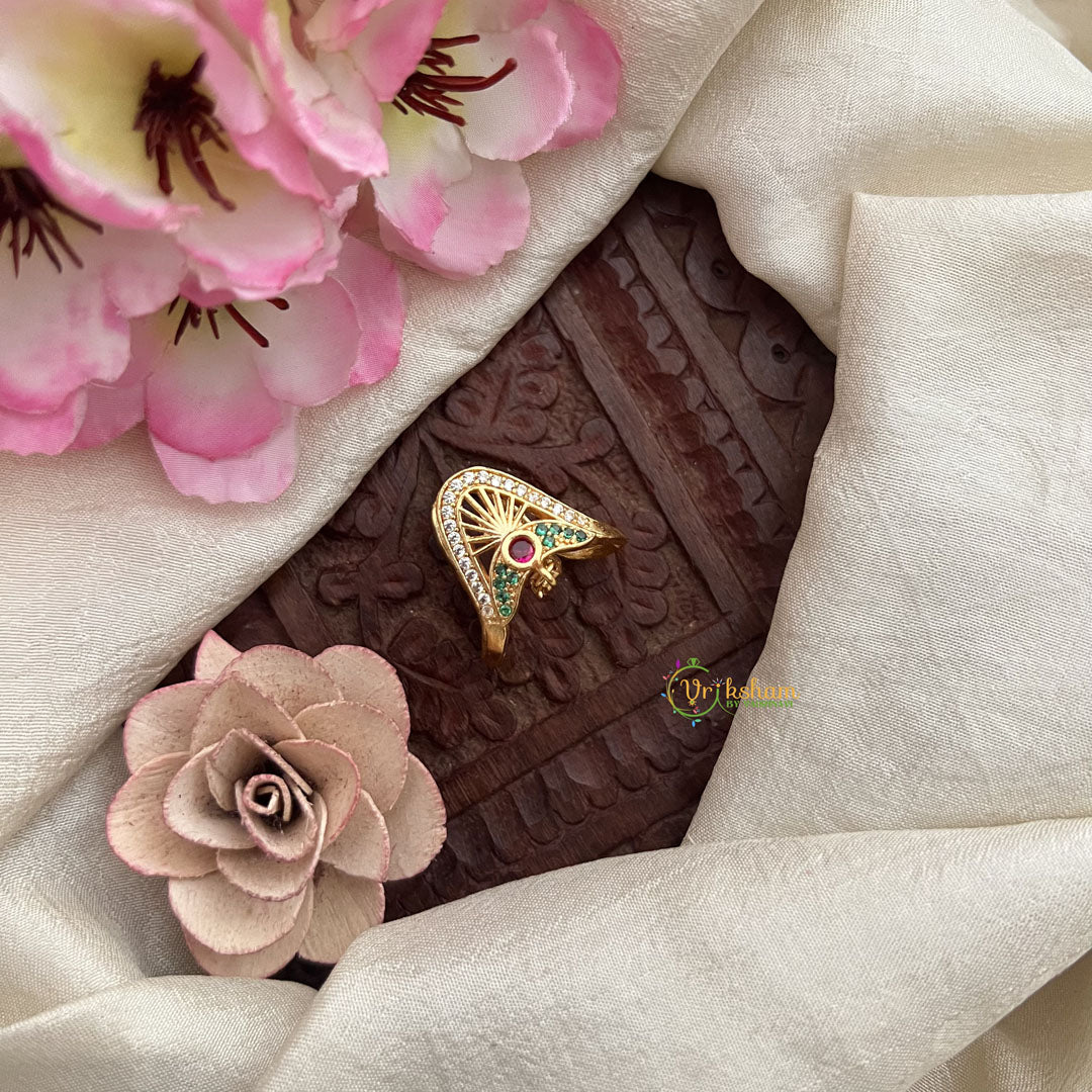 The Vriksham Designer AD Stone Gold Look Alike Vangi Finger Ring with Gold Bead detail combines exquisite AD stones with elegant bead accents, all set on a sophisticated gold-look base. This finely crafted ring offers a timeless accessory that enhances any outfit with refined charm and graceful style.