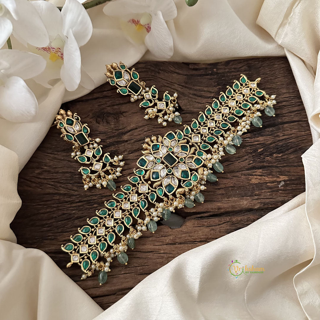 Experience the ultimate luxury with our Designer AD Stone High Neck Choker. Adorned with stunning green, pastel green bead, and pearl embellishments, this piece is a true work of art. Elevate any outfit and exude elegance with its exclusive design and luxurious materials.