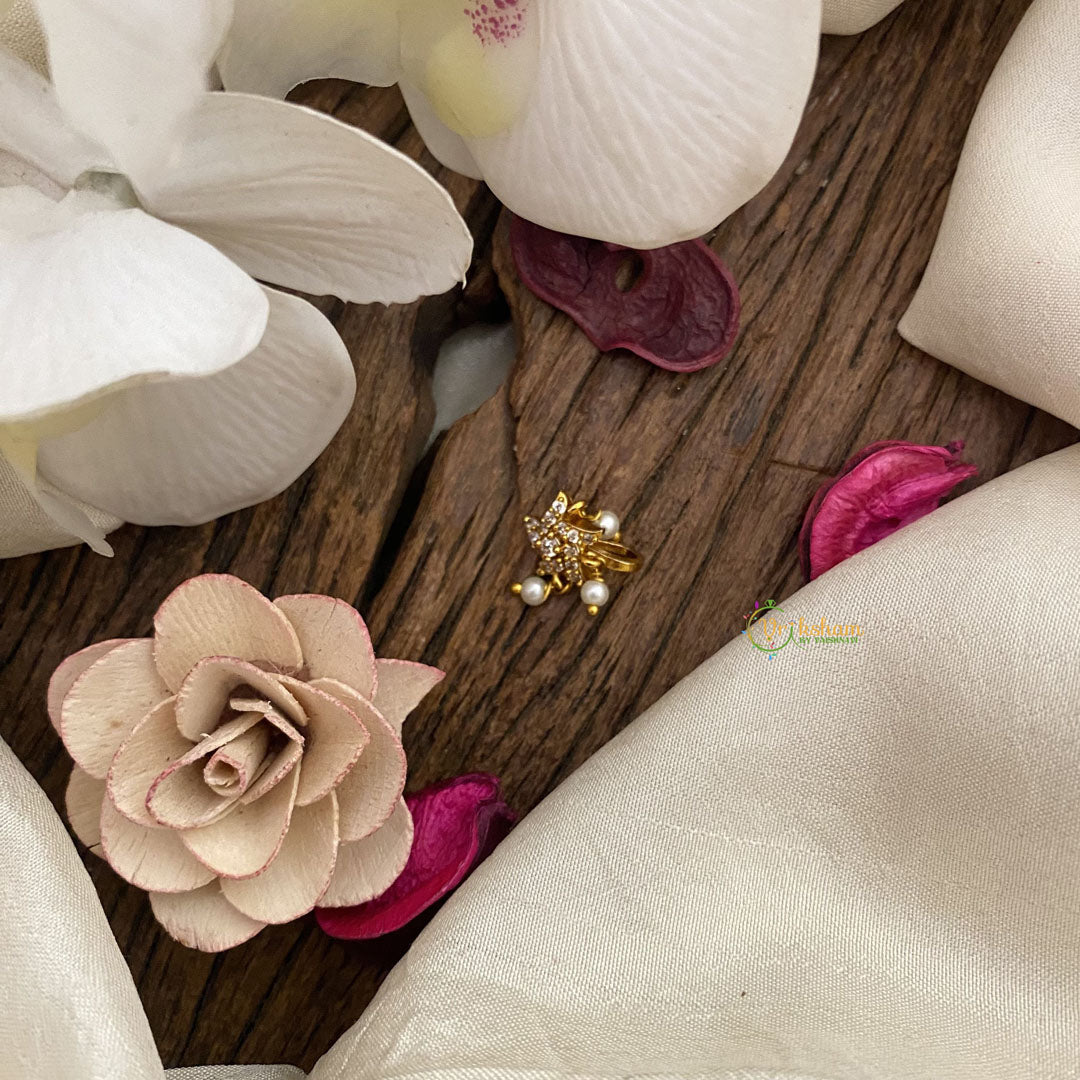 Elevate your look with the exclusive Vriksham Designer AD Stone Nath/Nose pin in Pearl-White. Featuring stunning AD stones, this piece adds a touch of sophistication and elegance to any outfit. Upgrade your style with this luxurious accessory.