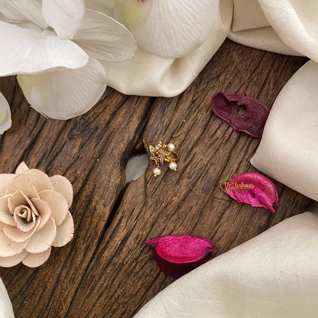 Elevate your look with the exclusive Vriksham Designer AD Stone Nath/Nose pin in Pearl-White Red. Featuring stunning AD stones, this piece adds a touch of sophistication and elegance to any outfit. Upgrade your style with this luxurious accessory.