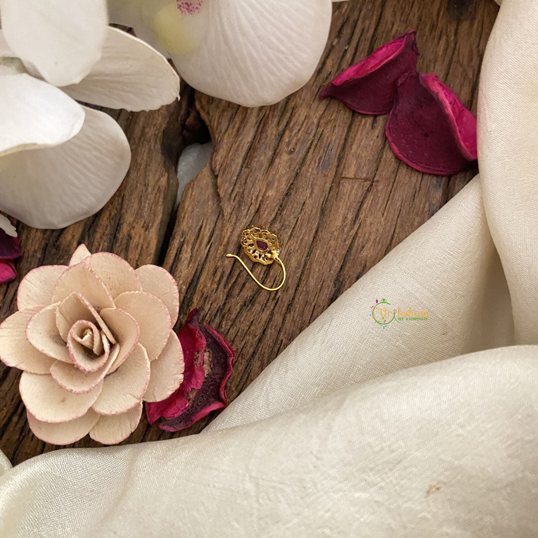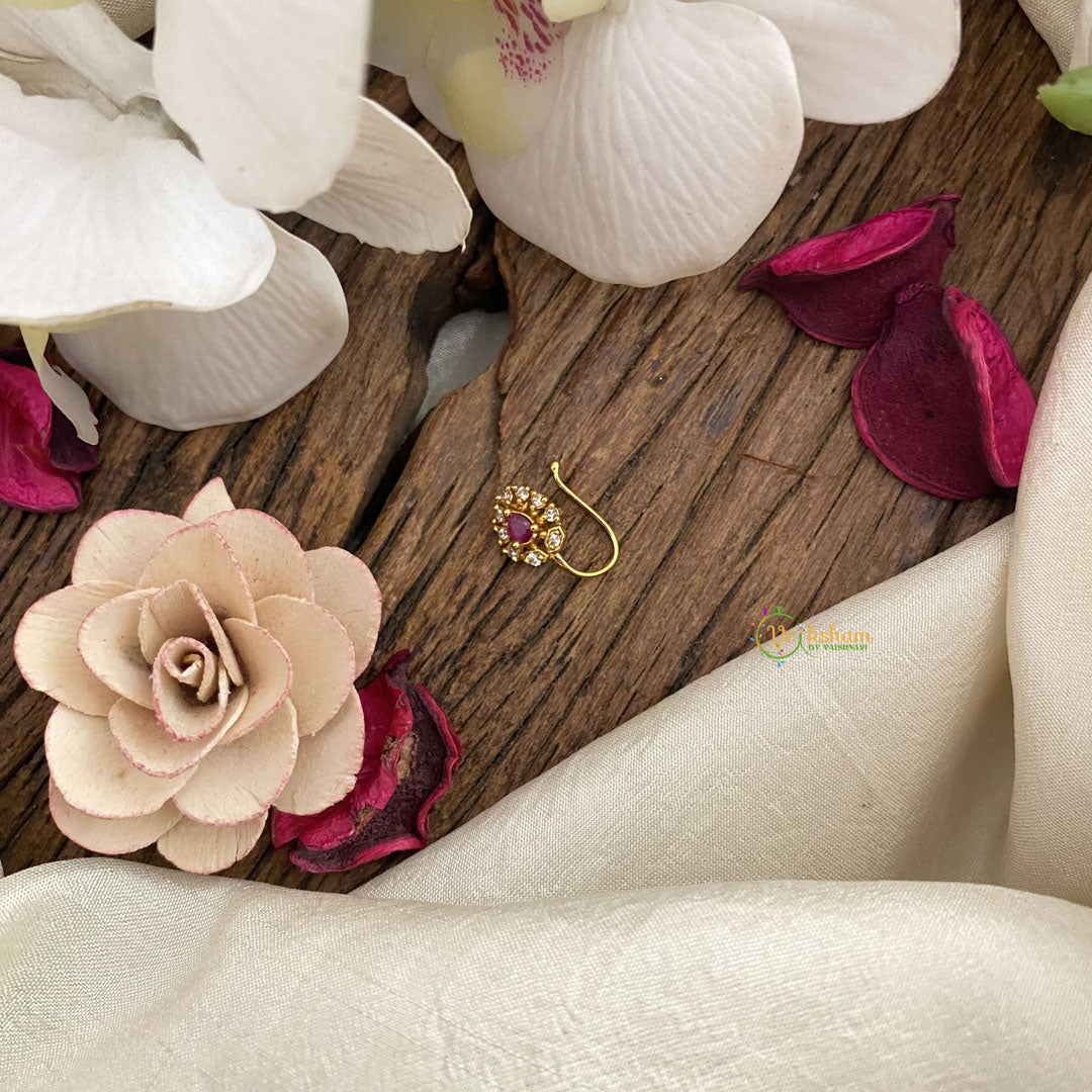 This stunning Vriksham Designer AD Stone Nath/Nose pin in red white has been carefully crafted to add a touch of elegance and sophistication to your look. The intricate design and sparkling stones make it a perfect accessory for any special occasion. Elevate your style with this luxurious piece.