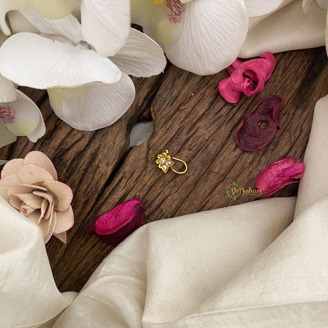 Elevate your style with the Vriksham Designer AD Stone Nath/Nose pin in White. Intricately crafted with sparkling stones, this piece adds a touch of sophistication to any look. Enhance your natural beauty and make a statement with this luxurious and exclusive accessory.