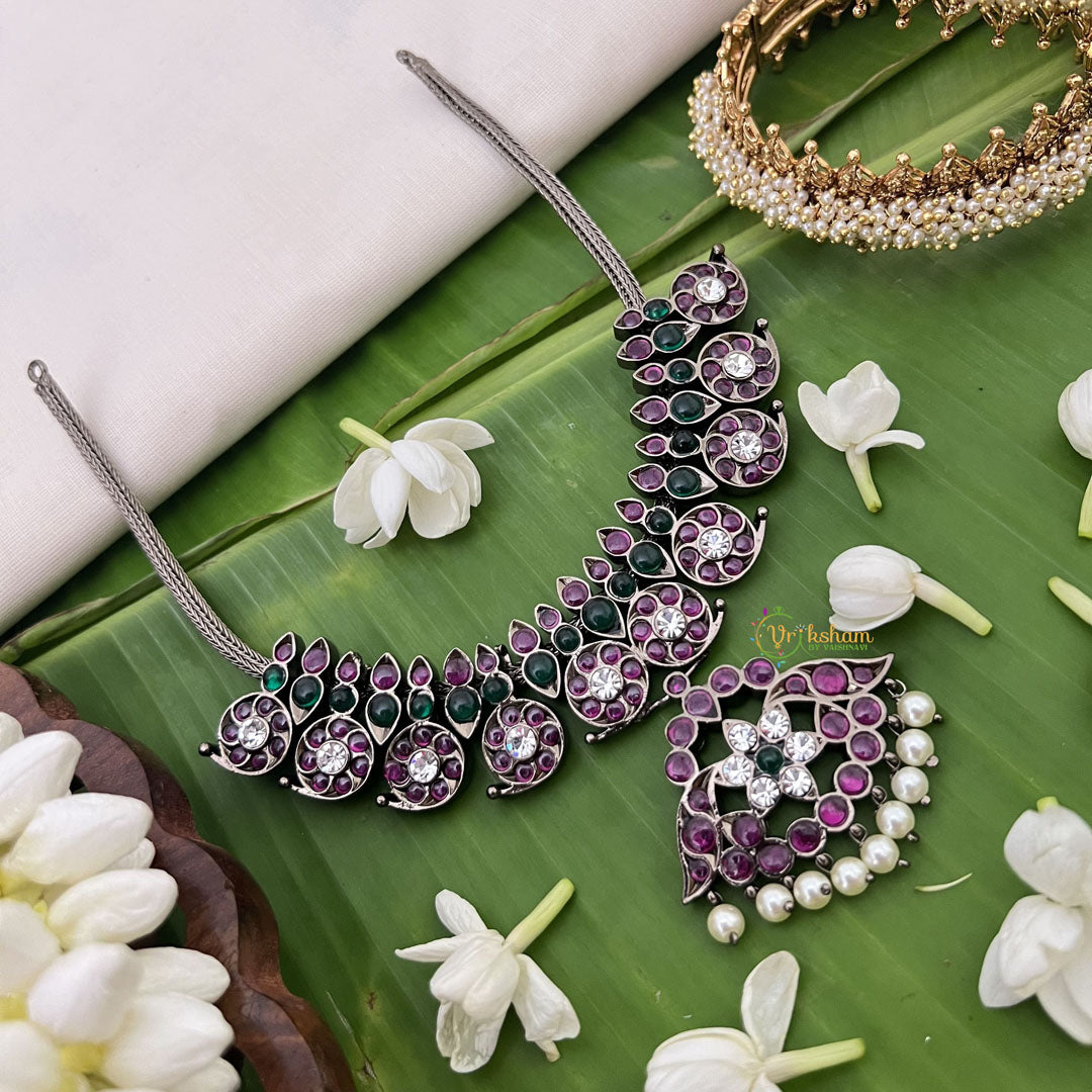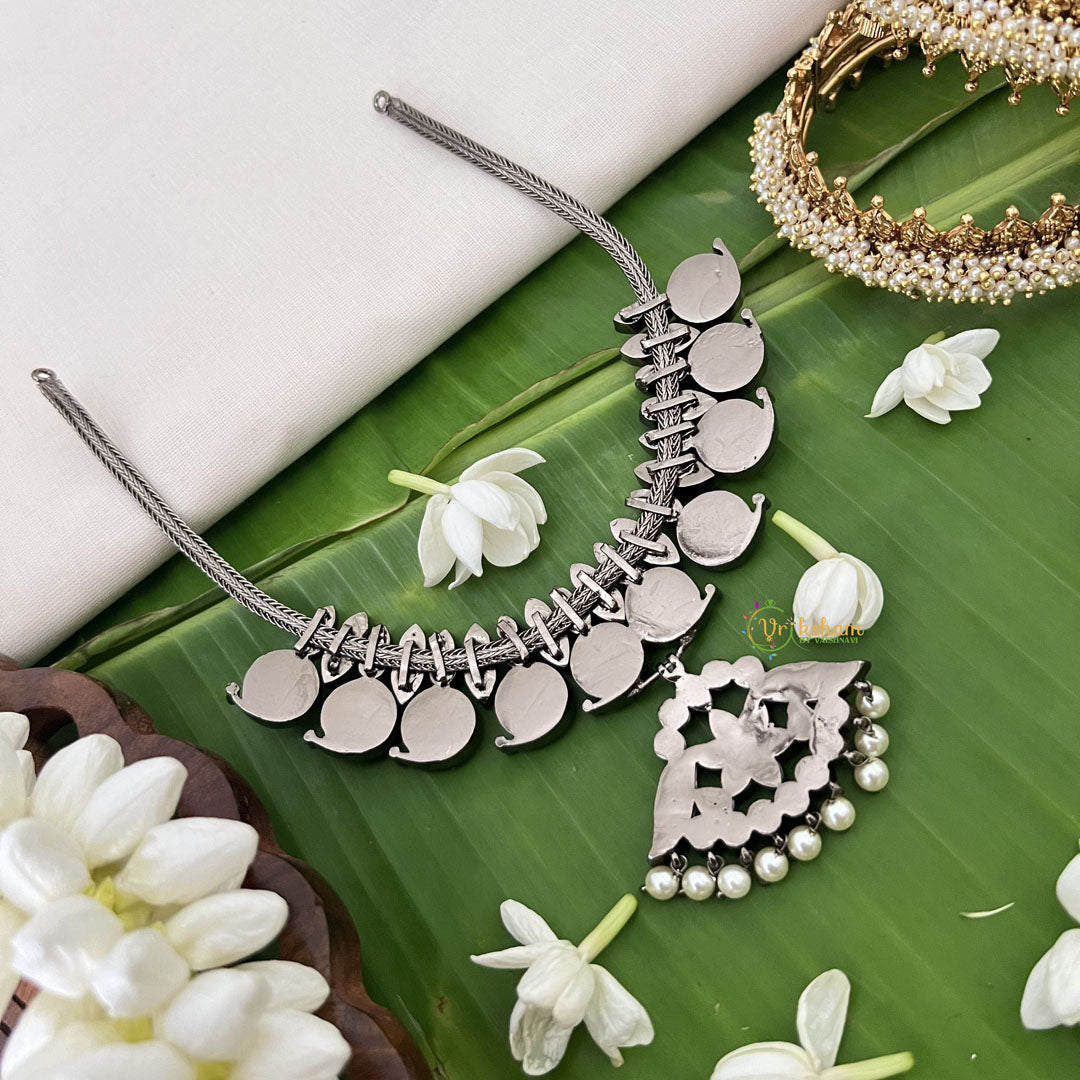 The Vriksham Designer Black Polish Traditional Precious Kemp Short Neckpiece with pearls combines classic craftsmanship with a contemporary edge. Its rich black polish and delicate pearl accents create a striking yet elegant statement, perfect for adding sophistication to traditional and modern ensembles alike.