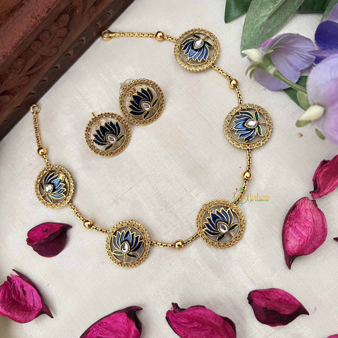 The Vriksham Designer Blue Lotus Cham with Green Leaf Neckpiece offers a sophisticated blend of artistry and elegance. Featuring a striking blue lotus design complemented by delicate green leaf accents, this piece brings a harmonious balance of color and form. Its refined craftsmanship and distinctive style make it an ideal accessory for those seeking timeless grace with a fresh, nature-inspired touch. Perfect for elevating both formal and casual ensembles.
