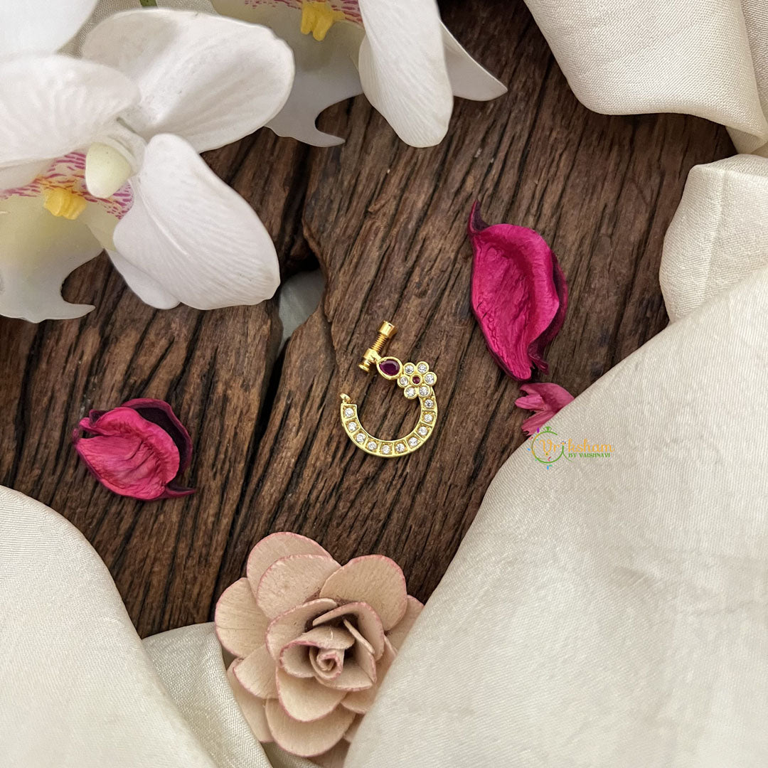 The Vriksham Designer Bridal Naths/Nose Pin in red and white combines classic hues with exquisite craftsmanship. This elegant piece enhances bridal attire with its refined design, offering a perfect balance of tradition and sophistication for your memorable occasion.